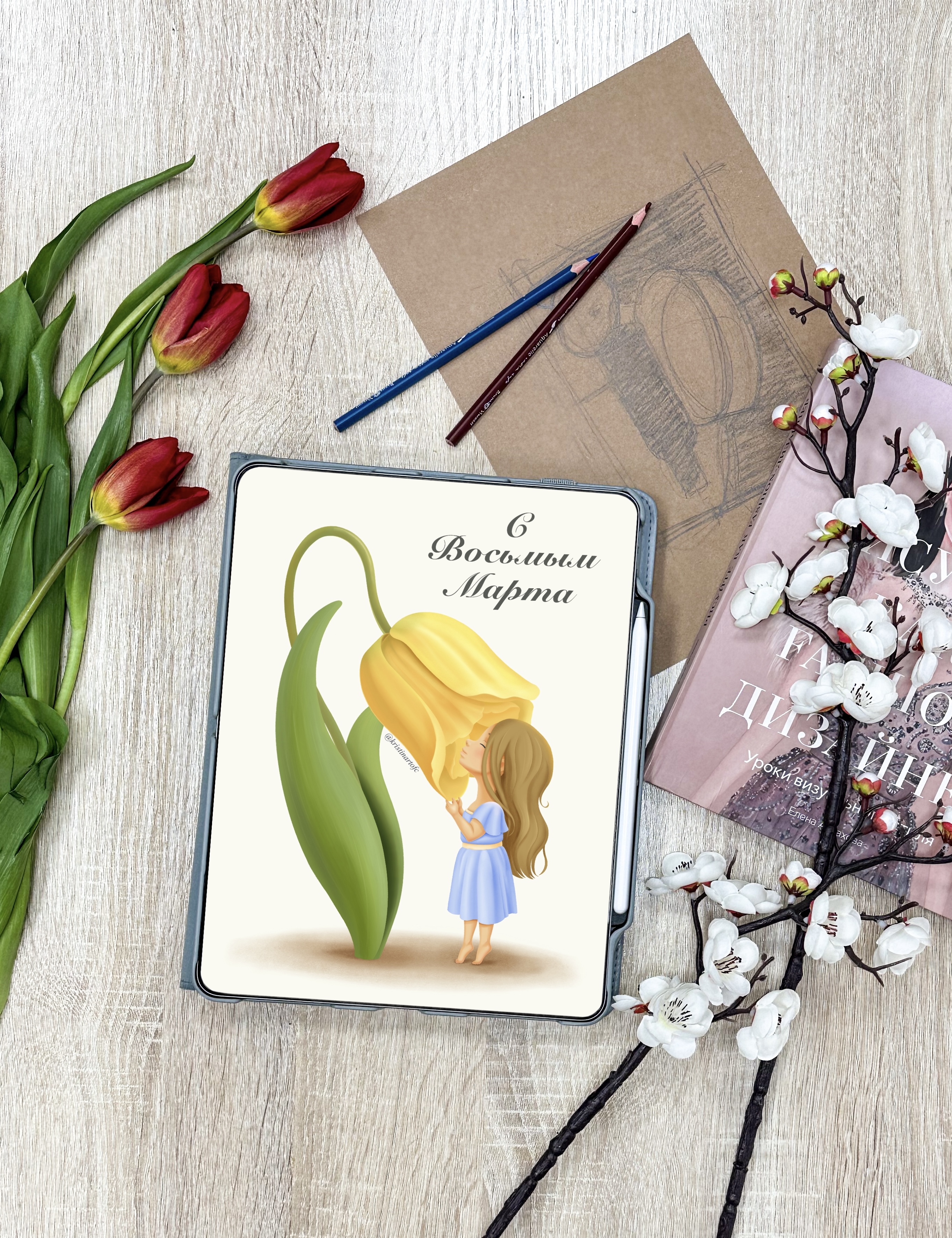 Открытка к празднику «8 марта». Отрисовка в Procreate в стиле милой иллюстрации.