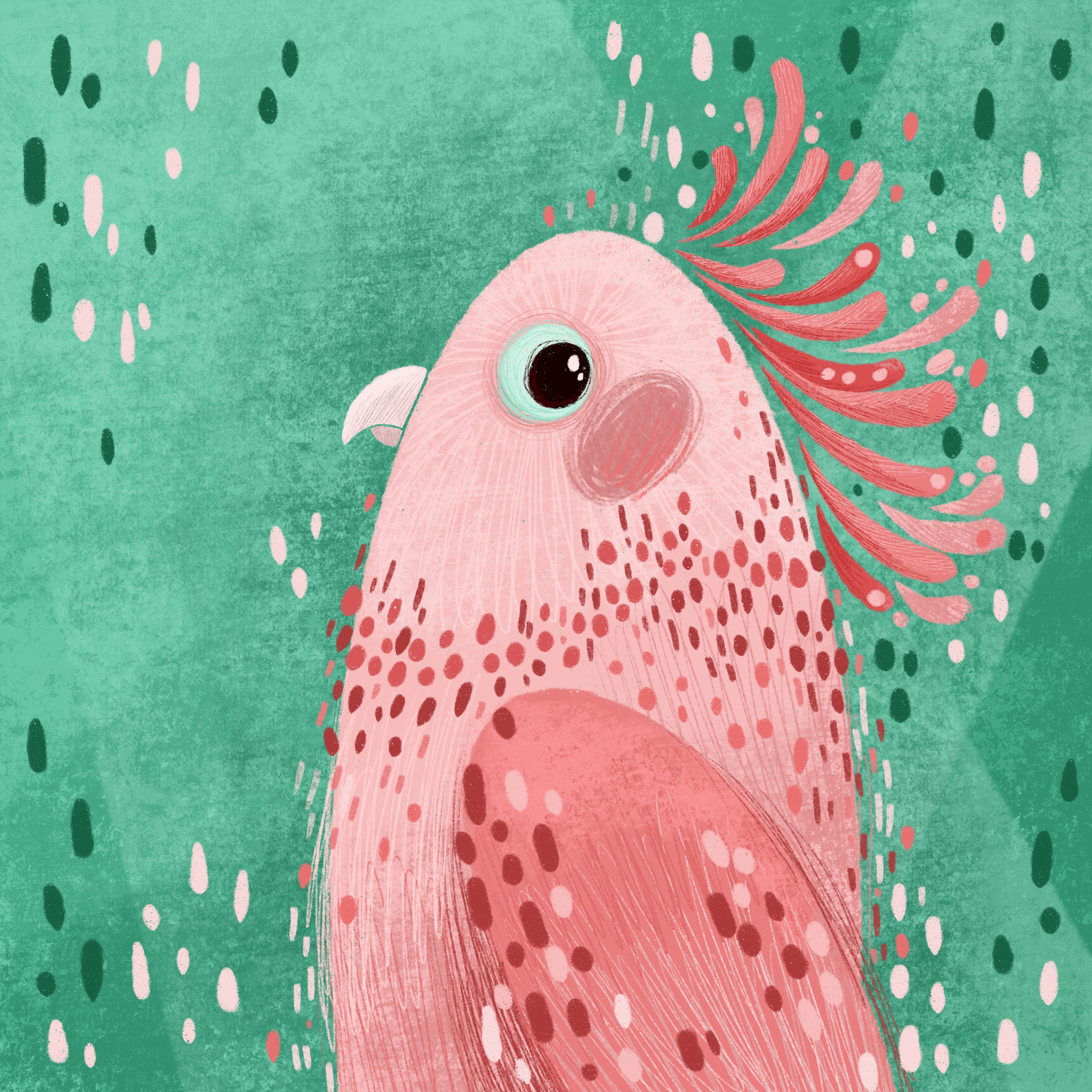 Розовый попугай на зеленом фоне. Вокруг персонажа пятнышки розовых и зеленых оттенков
