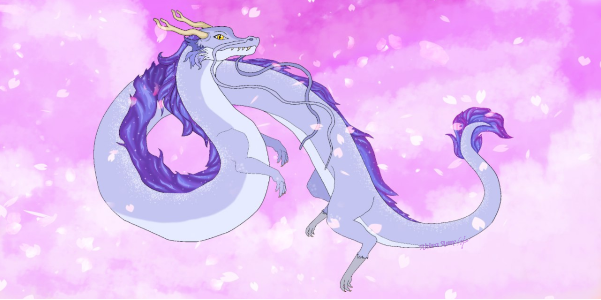 Art illustration of a Japanese dragon through the cherry blossom clouds🐉🌸