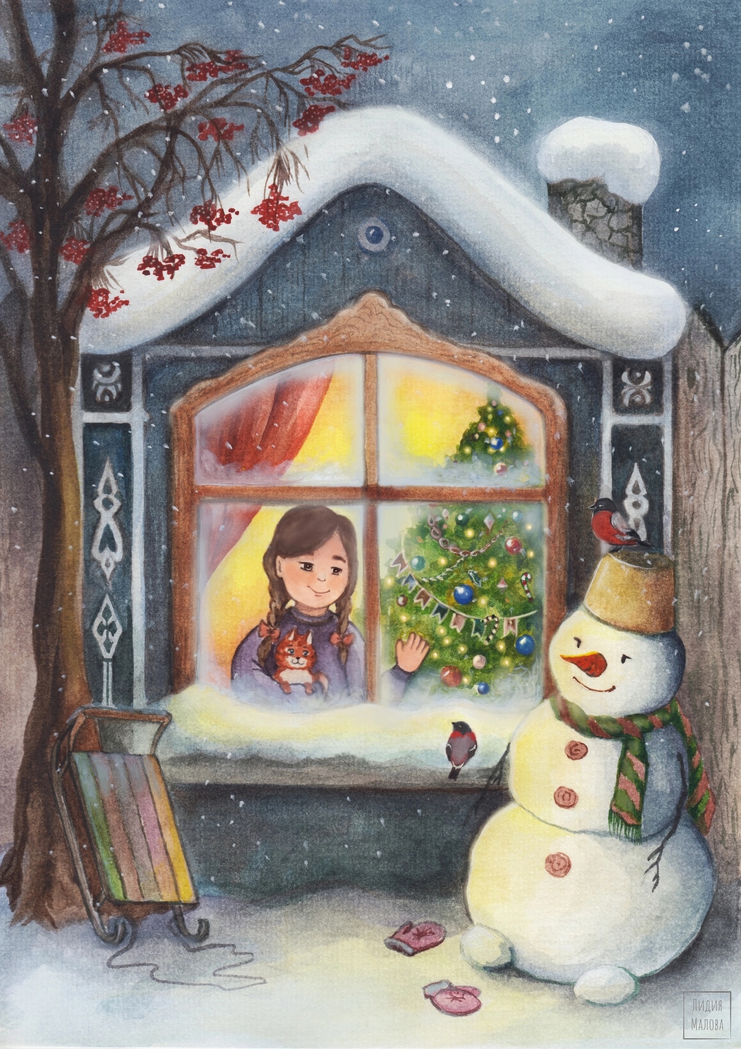 Открытка к Новому году. Акварельная иллюстрация, А4