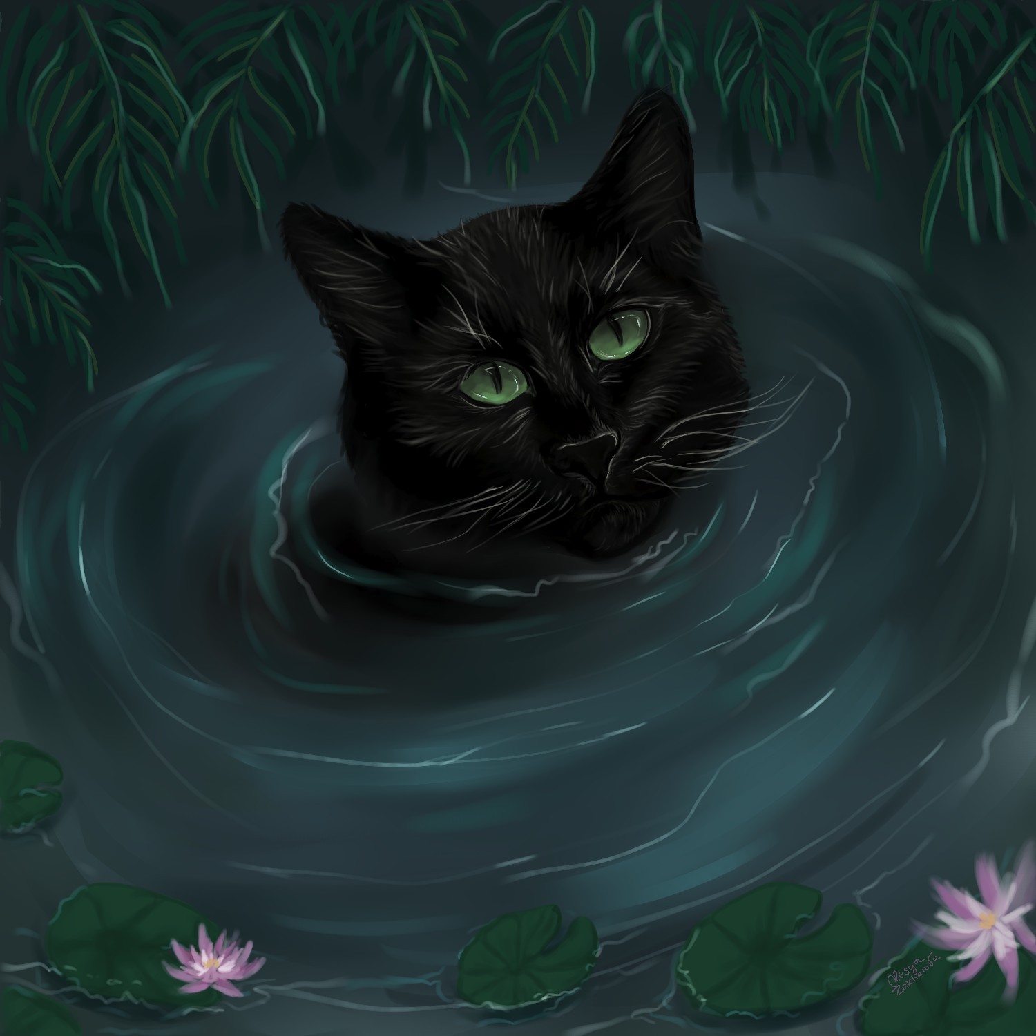 Черный кот в воде