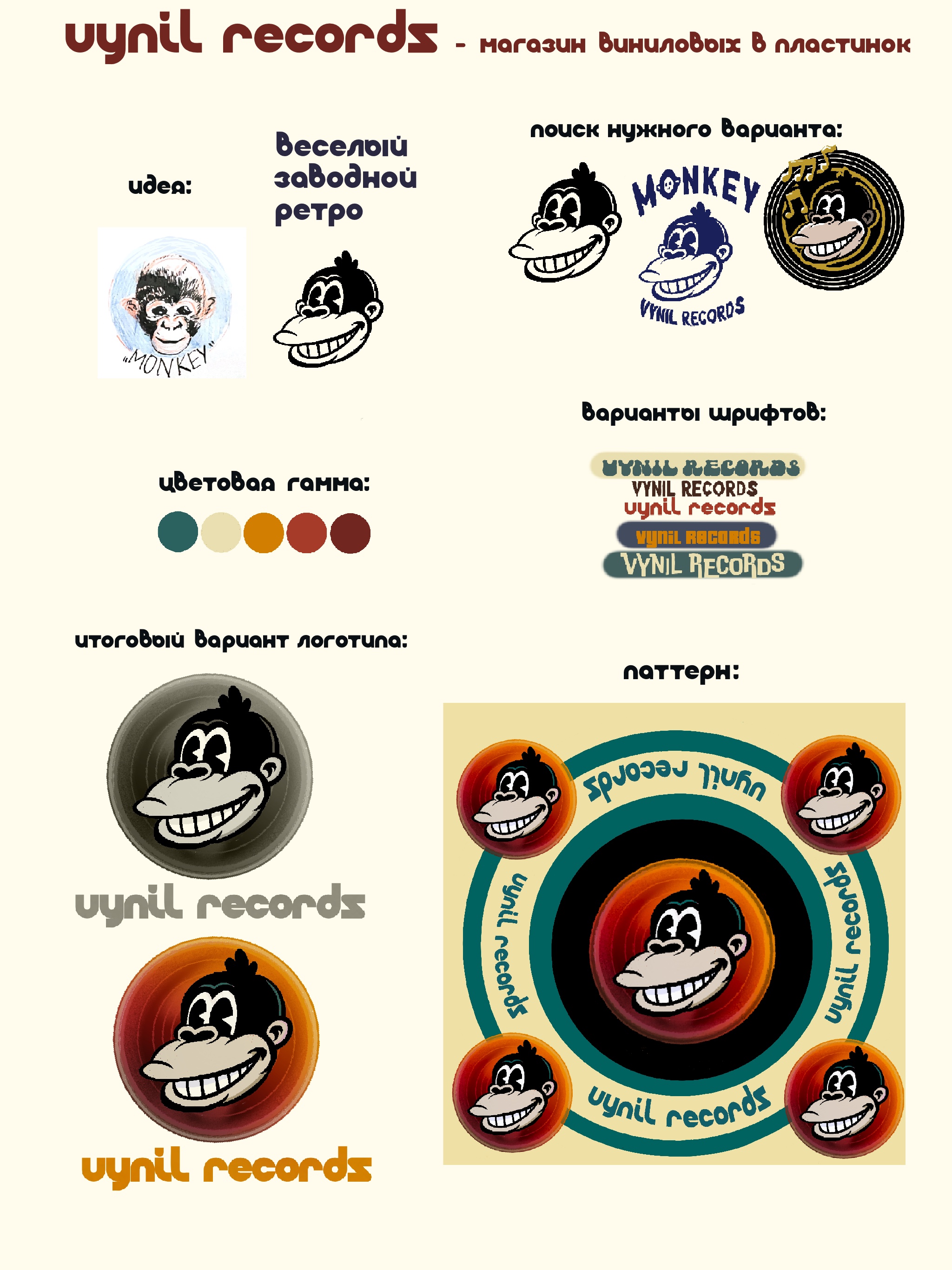 Разработка концепта логотипа для магазина виниловых пластинок (с использованием выбранного животного-обезьяна)