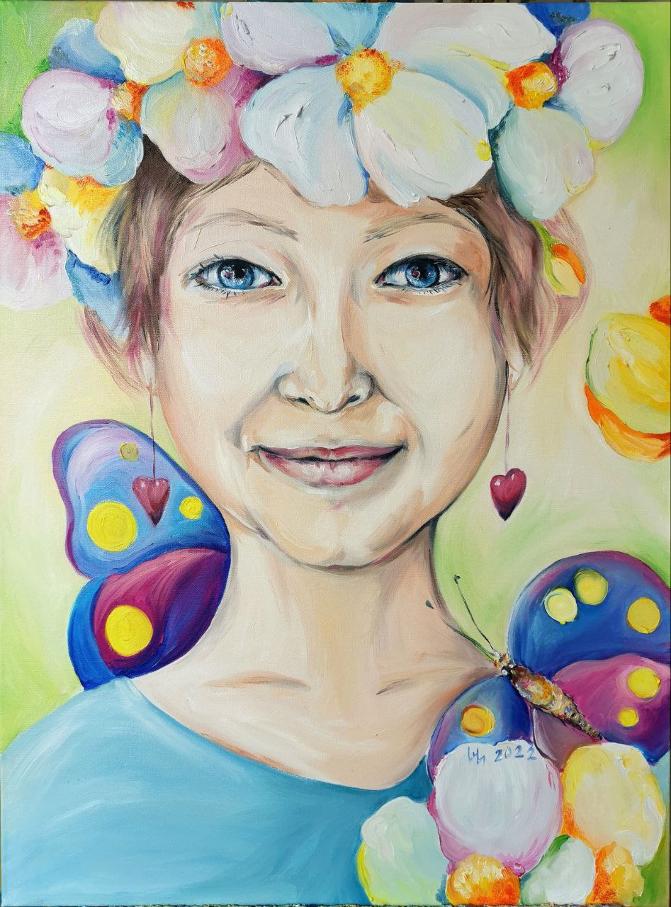 Счастливая девочка с бабочками и цветами