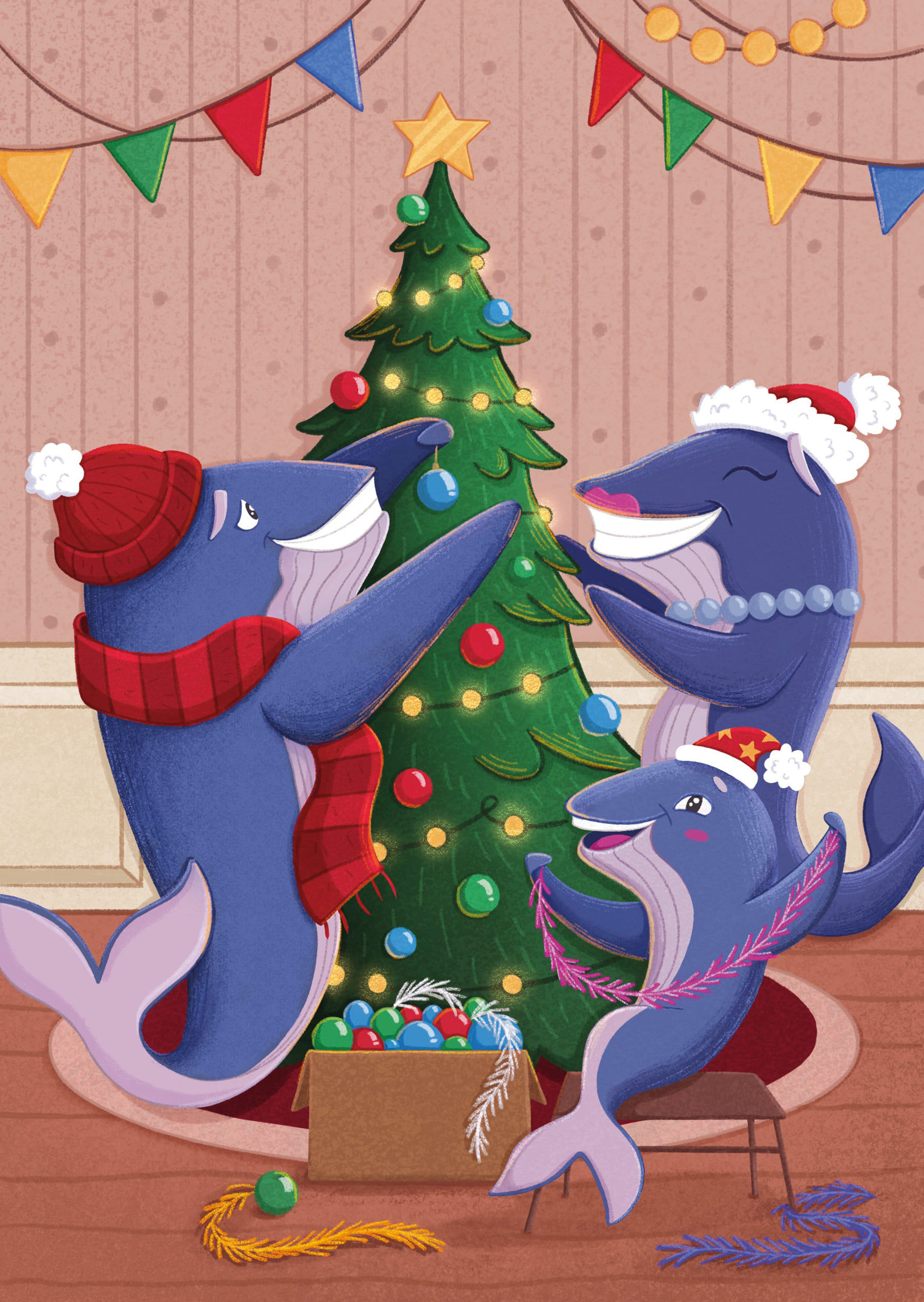 Семья китов радостно наряжает ёлку