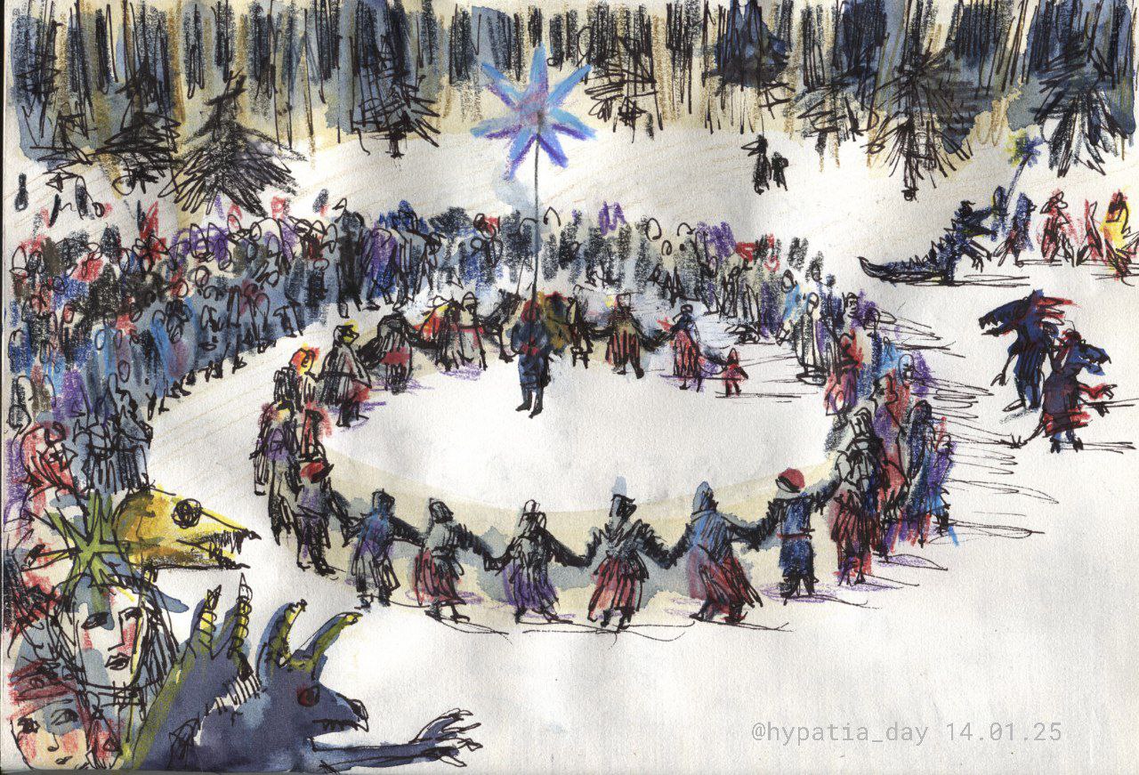 На тему хоровод, колядки. Акварель, тушь, цветные карандаши.