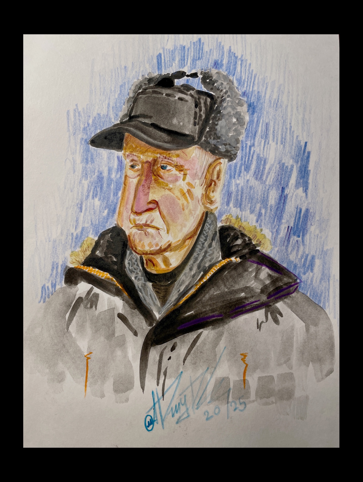 Акварельная зарисовка случайного пассажира в метро. Работа выполнена детской акварелью