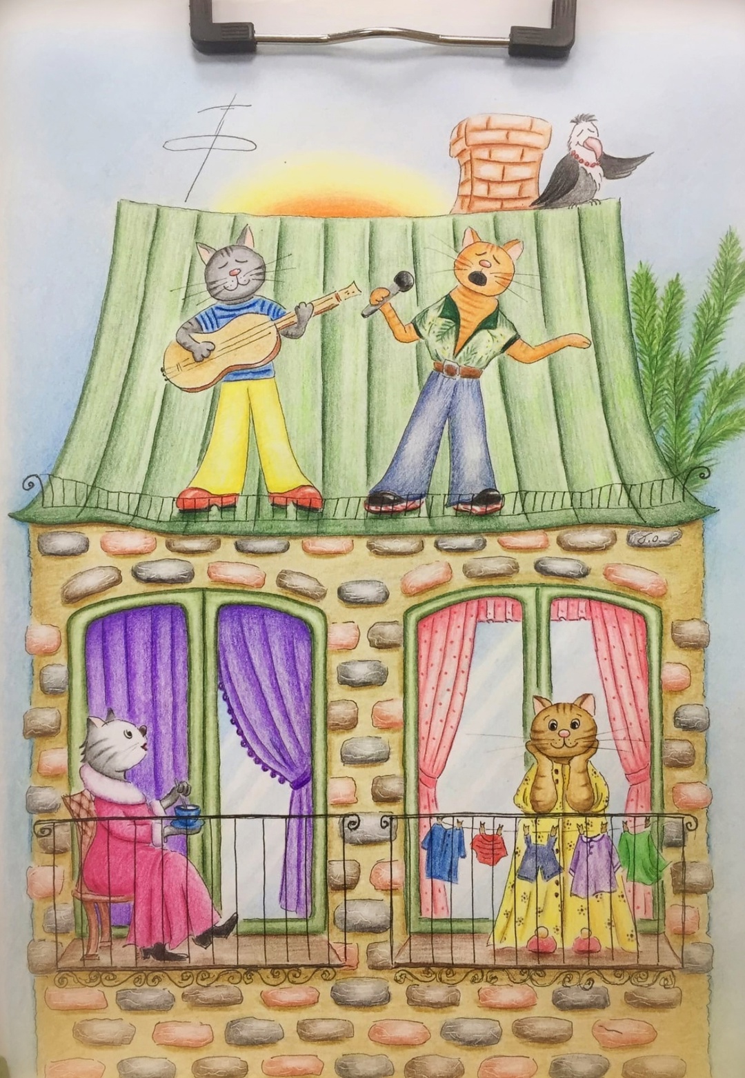 Сказочный дом, поющие коты, милые кошки. Иллюстрация цветными карандашами.