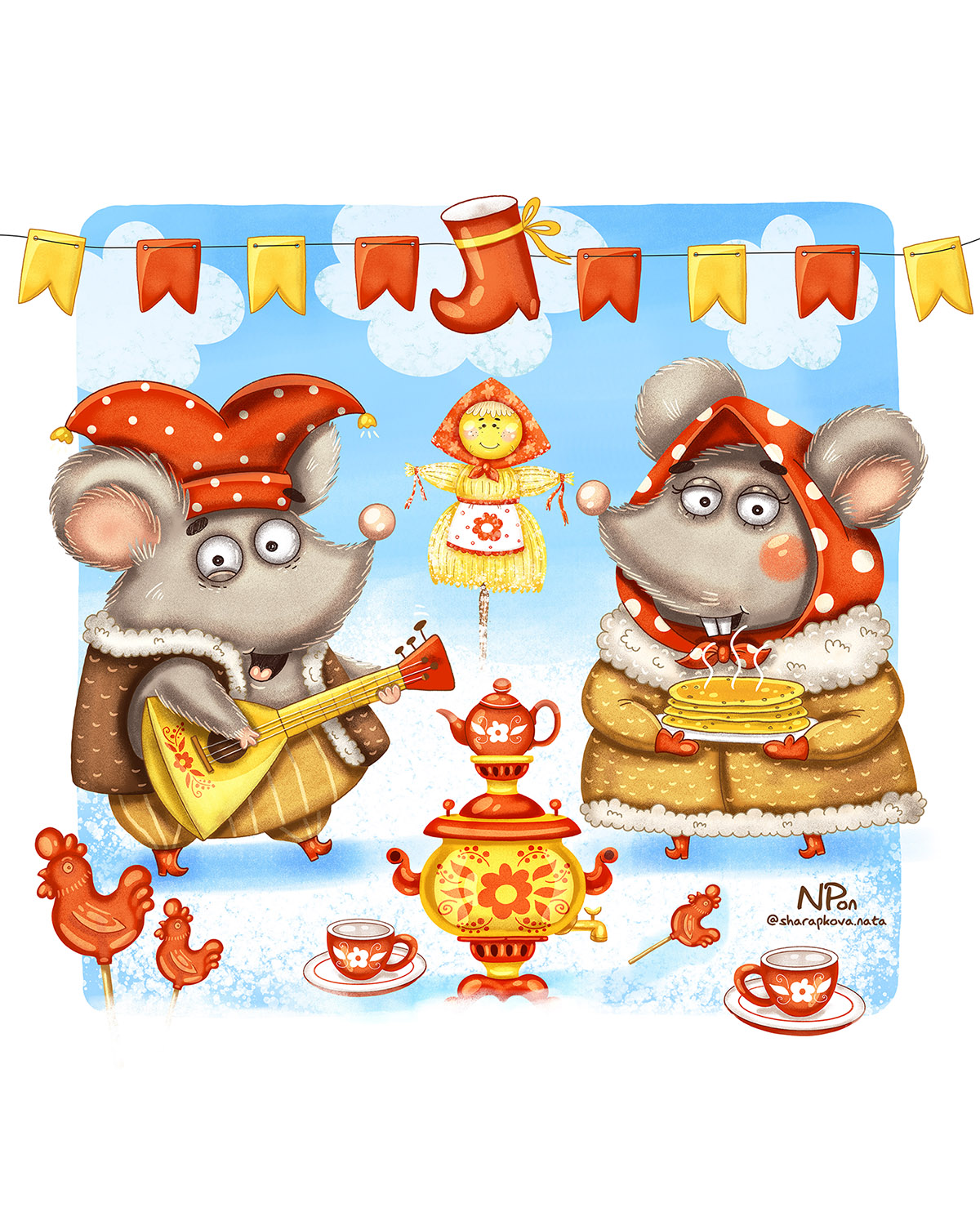 Серия иллюстраций из жизни мышиного семейства. Иллюстрации выполнялись для оформления рабочих листов с головоломками для занятий с дошкольниками на тему праздника Масленица.