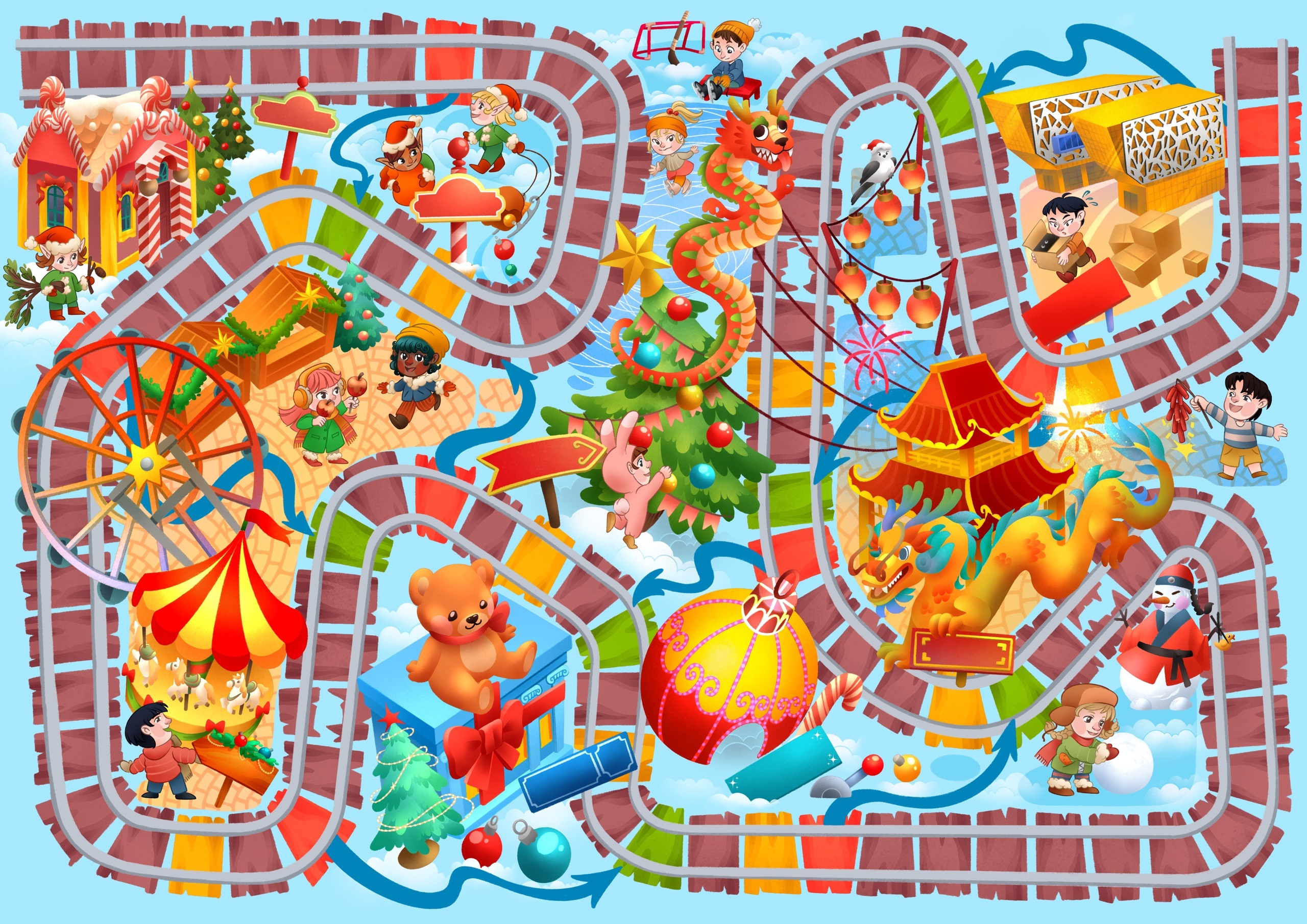 Поле для новогодней настольной игры. Сочетает симоволические символы нового года, рождества и китайского нового года.