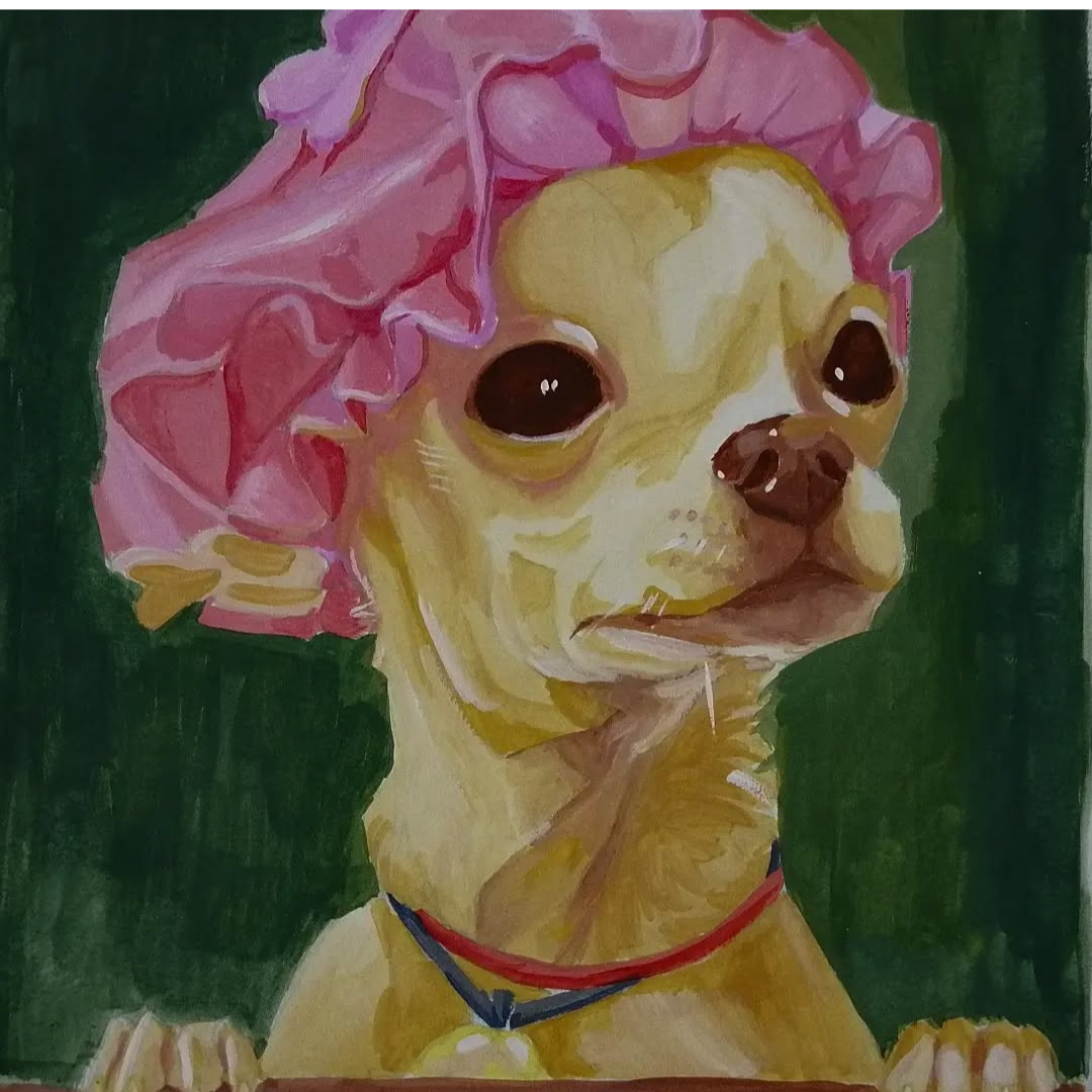 Работа по фотографии питомца в ванной с розовой душевой шапочкой.