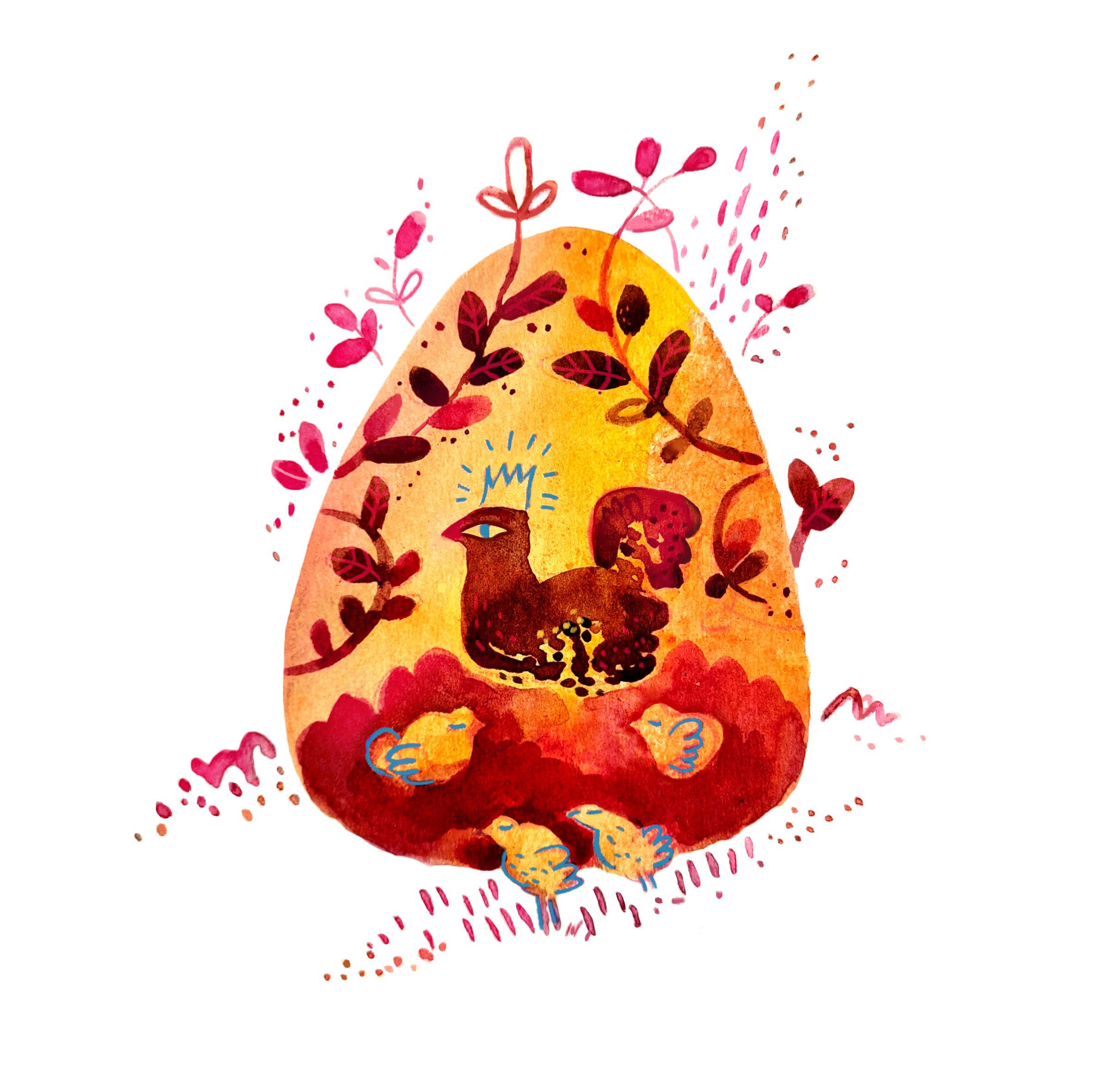 Золотой желток, малиновые растения и голубая корона. Невольно нарисовала логичесикий парадокс про первичность яйца или курицы. Яйцо как символ жизни, в котором зарождается та, которая его и сотворила.