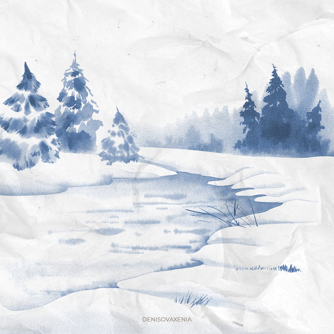 Зимний пейзаж, заснеженные ели и река. Акварельная монохромная иллюстрация озера в снегу с лесом. Минималистичный фон для дизайна открытки, плаката, баннера. Зимние каникулы.