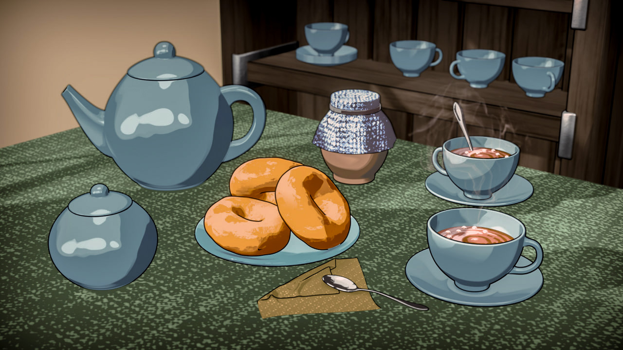 Чайный набор, пончики к чаю, салфетка и баночка с медом. Тут создавался шейдер, сложная работа с тенями, сложная палитра. Обводка с помощью нормалей.