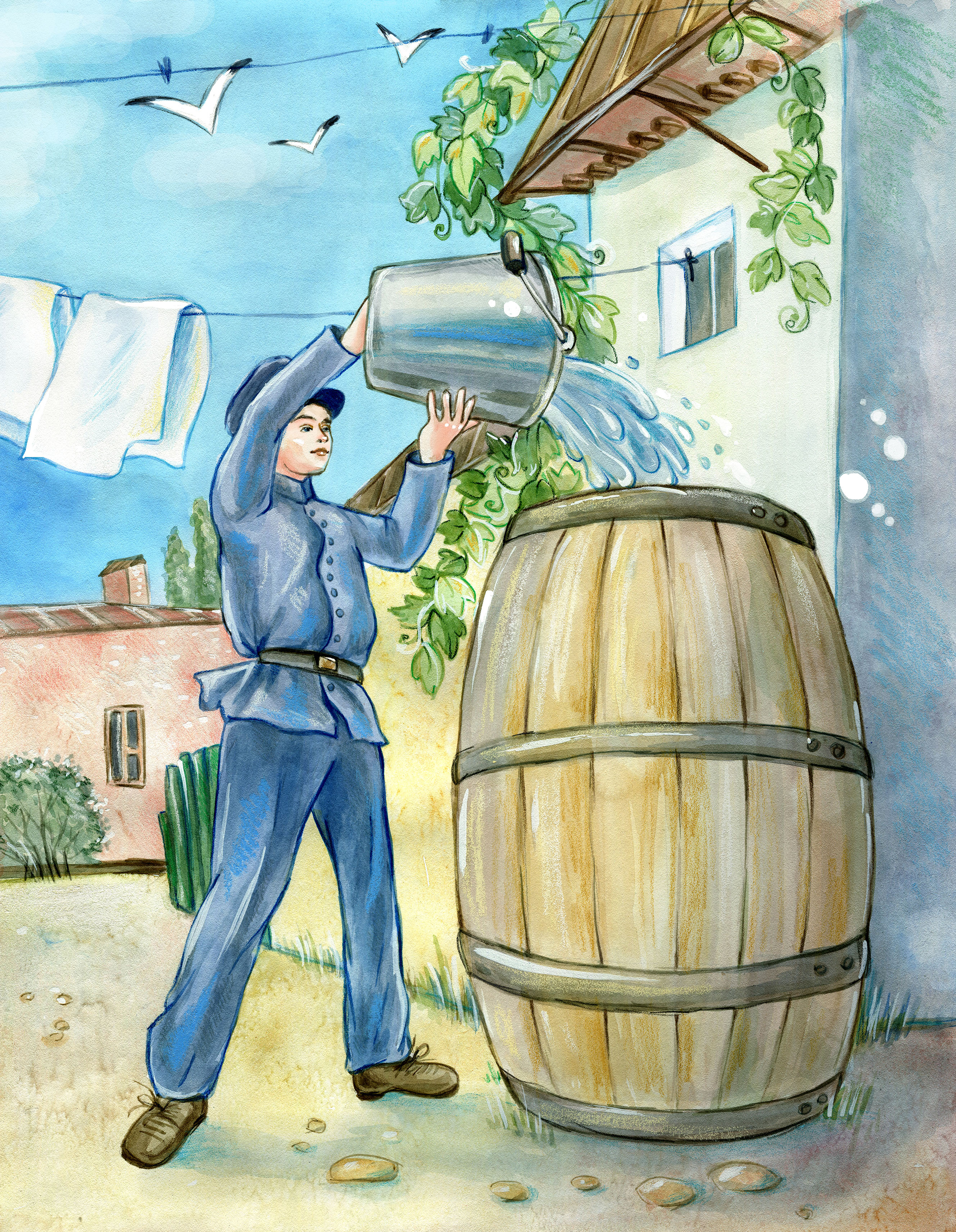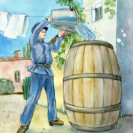 Коля в детстве у дома в Одессе, набирает воду