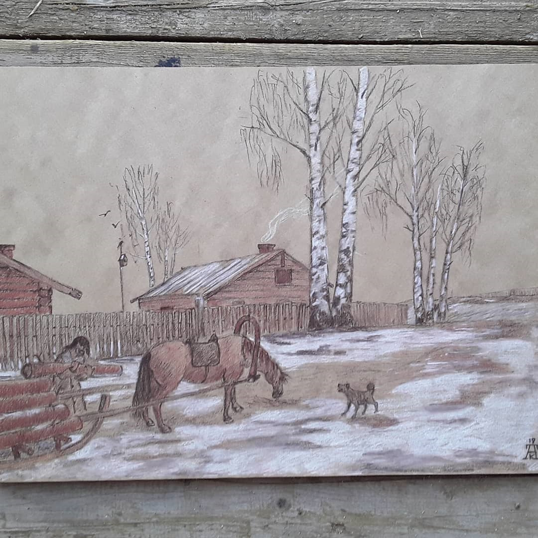Деревенская сцена в смешанной технике (сангина, уголь)
