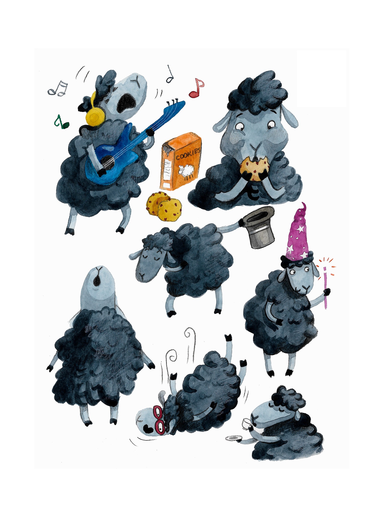 Это лист персонажа одной забавной чёрной овечки по имени Баа. Через различные позы и ситуации я раскрываю её характер: она поёт и играет на гитаре, с удовольствием ест печенье, занимается магией, делает акробатические трюки и наслаждается чашечкой чая.