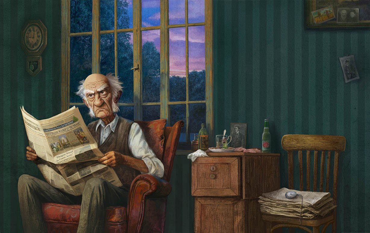 Да, пейзаж за окном делает историю, почти также сильно бьет в бессознательное, как и на картинах Эндрю Уайета. Прекрасно памятая газета, шикарное затертое кресло, ну и дедуля безусловно хорош, острые коленки с газетой отлично рифмуются. Вообще такие тонкие интеллигентные находки, обзавидовался