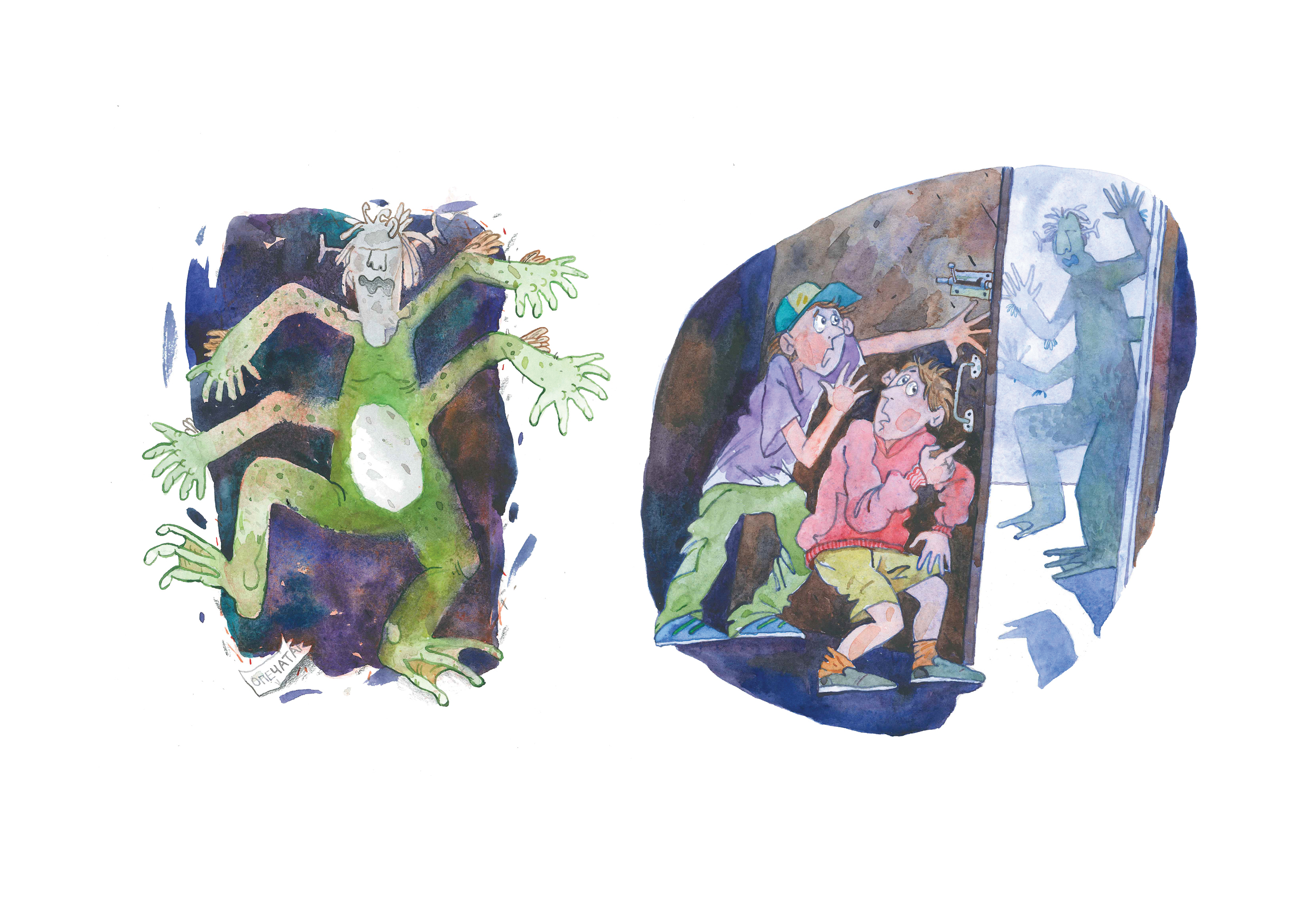 Иллюстрация к детскому сочинению о двух приятелях, которые пробрались в школу ночью и встретили таинственное инопланетное чудовище.