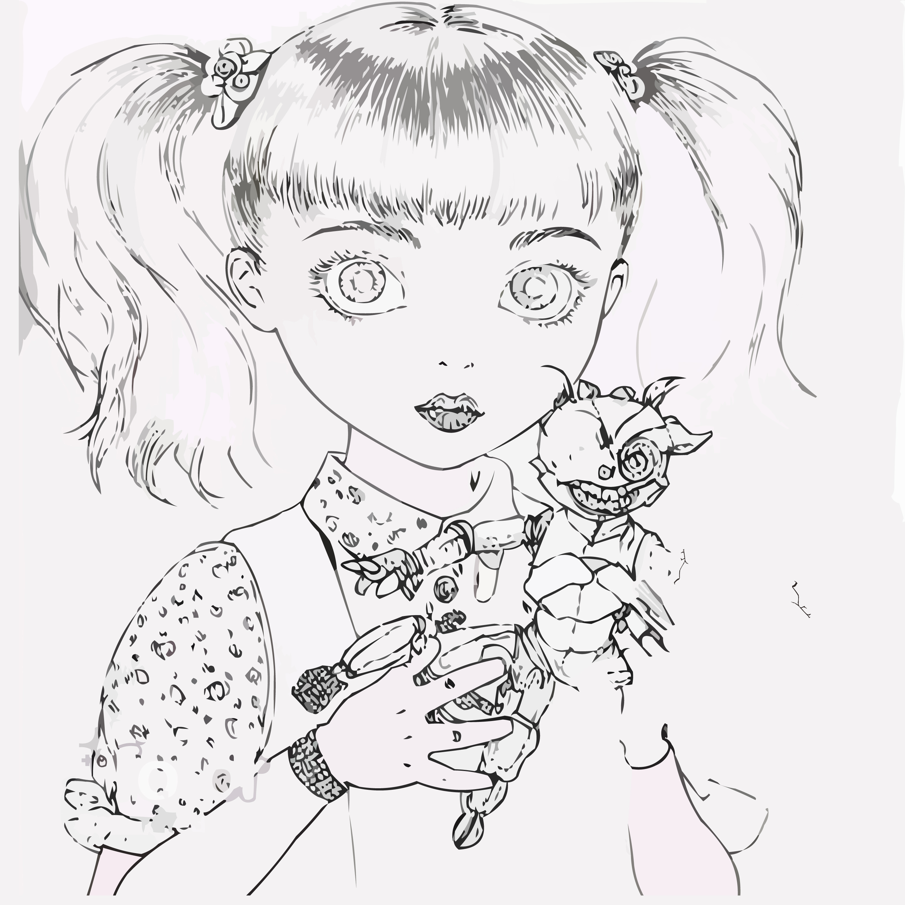 Девочка лет 6-7 держит в руках поломанного монстрика. скетч