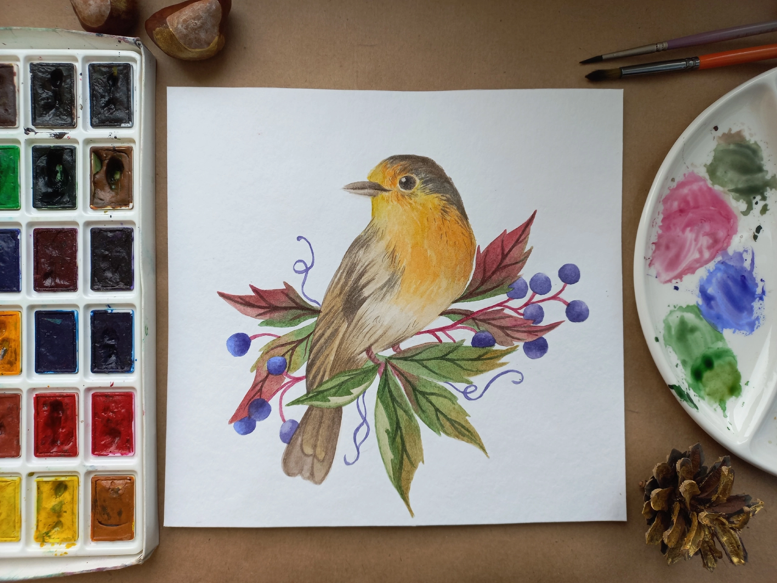 Птица зарянка и дикий виноград💛