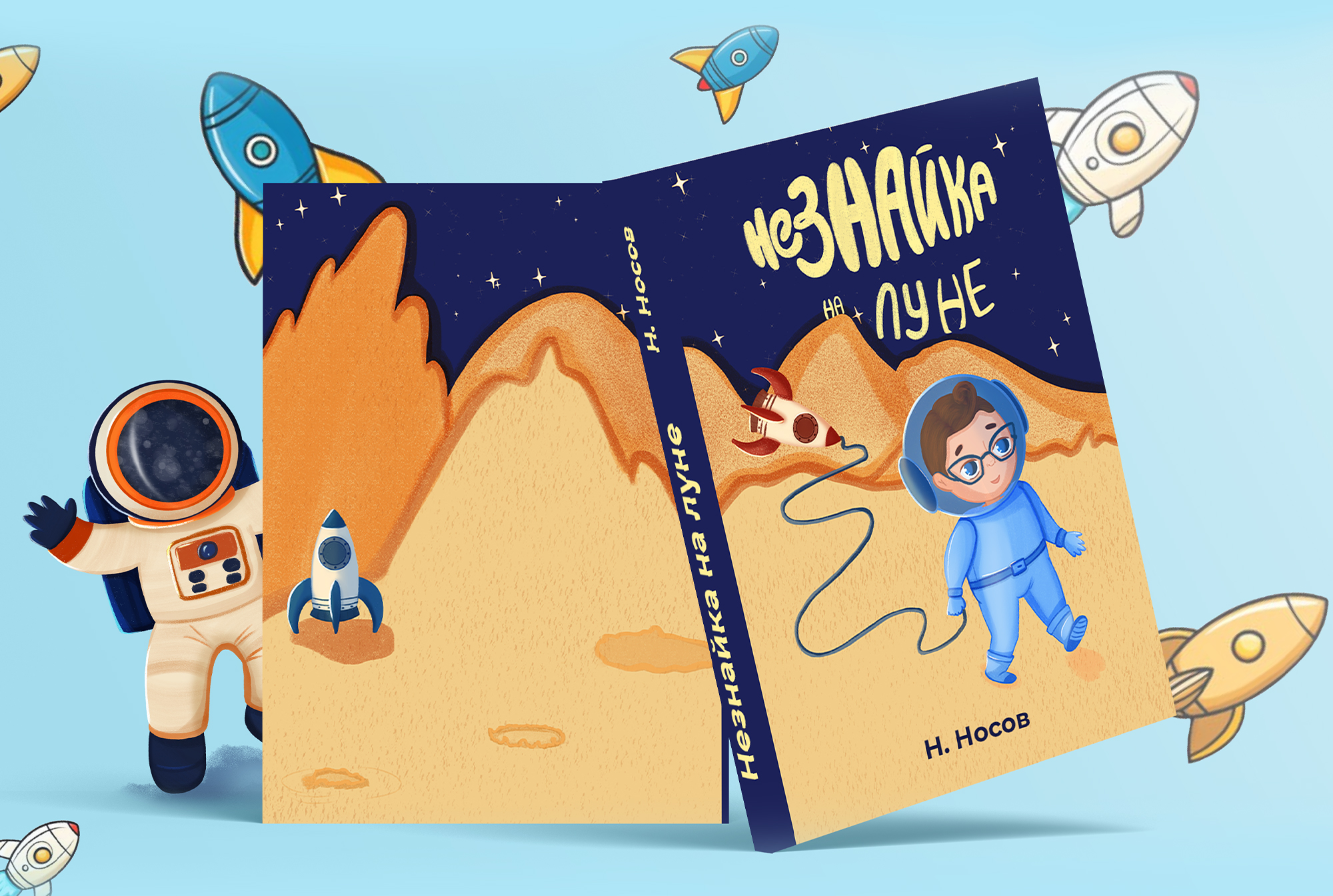Я отошла от классической обложке и изобразила фрагмент рассказа когда Знайка прилетает на помощь к незнайке на луну.