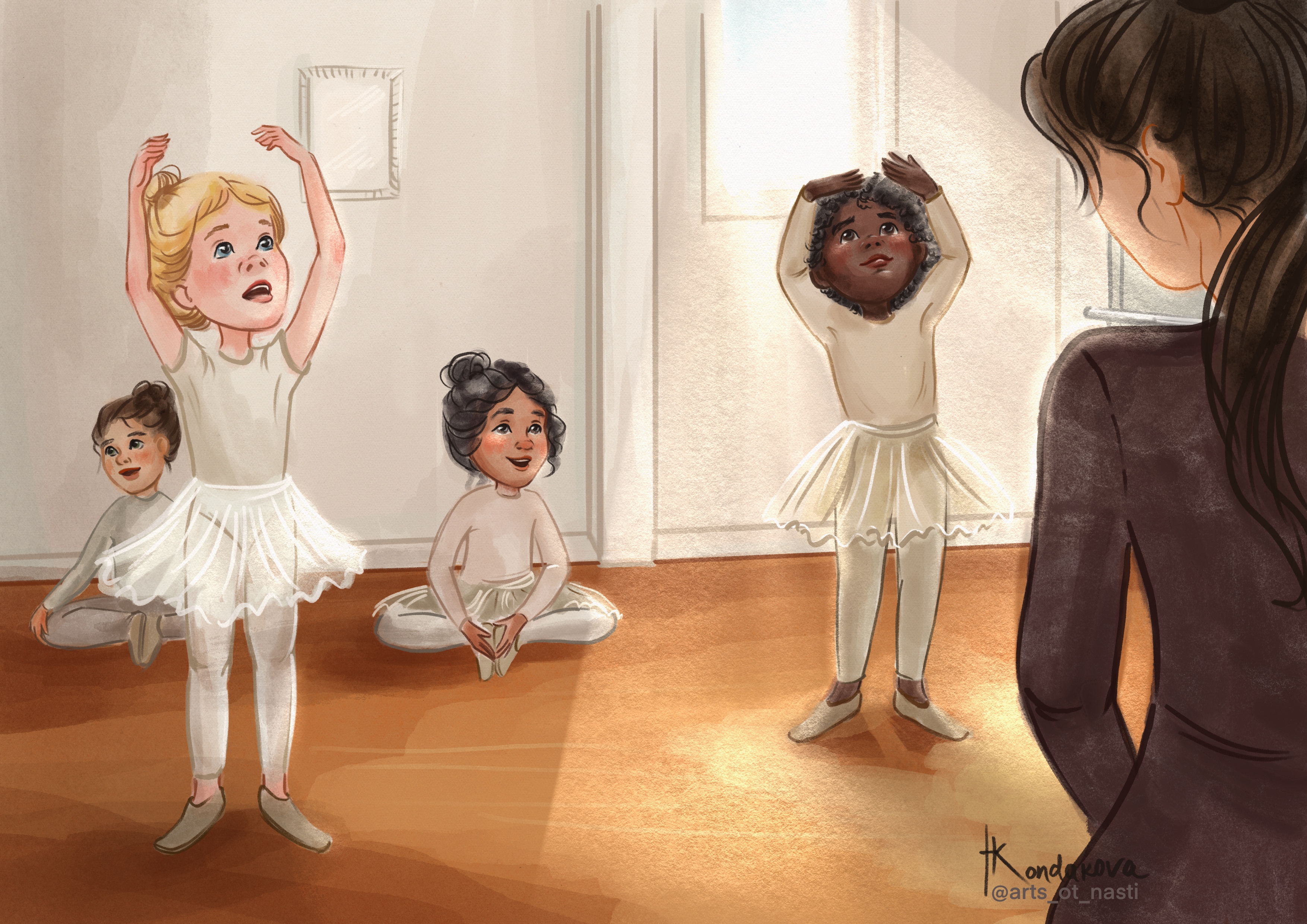 На уроке в балетной школе. Три подружки только начали заниматься, и это их второе занятие.