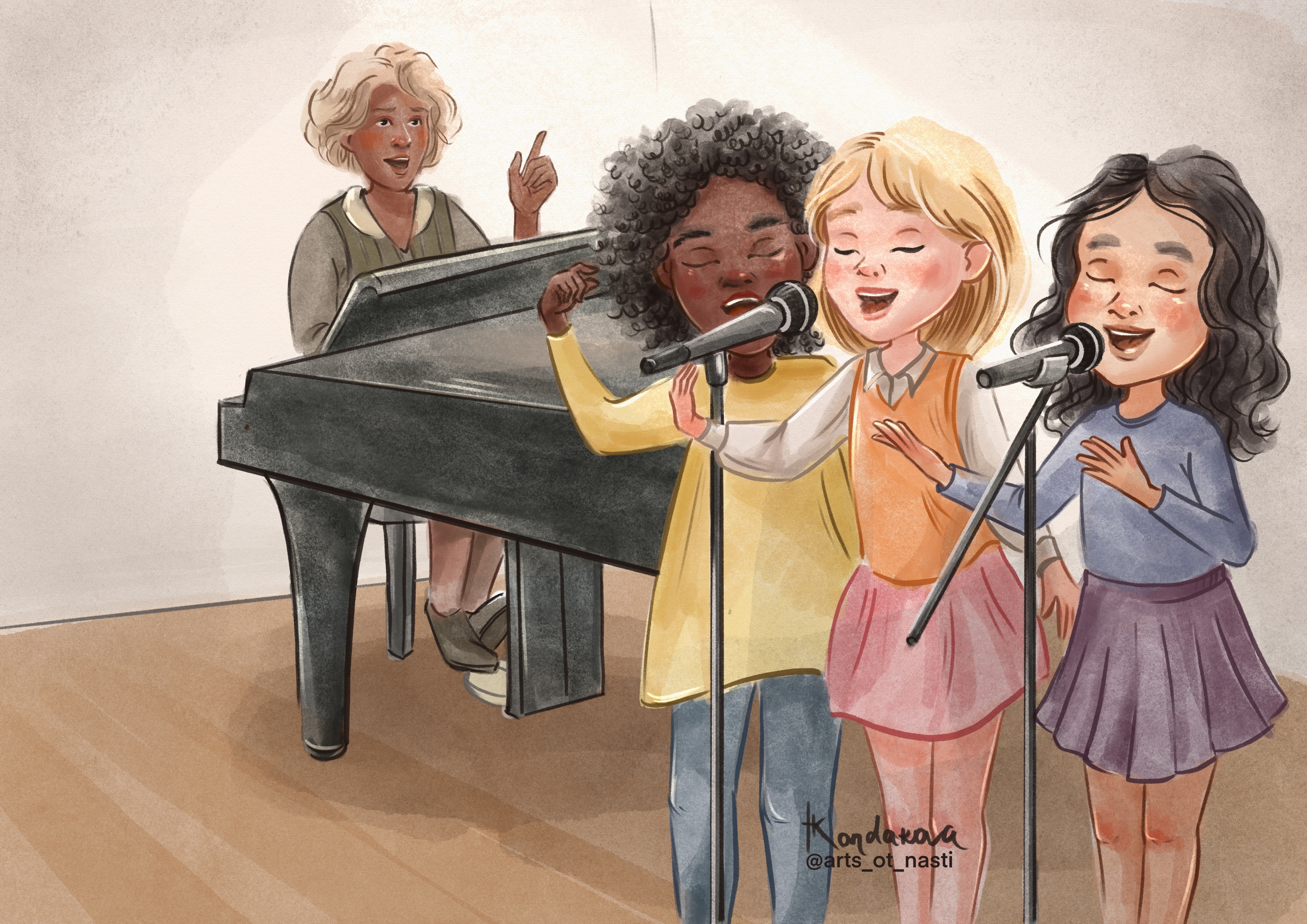 Три подружки вместе участвуют в школьном конкурсе талантов. Репетиция
