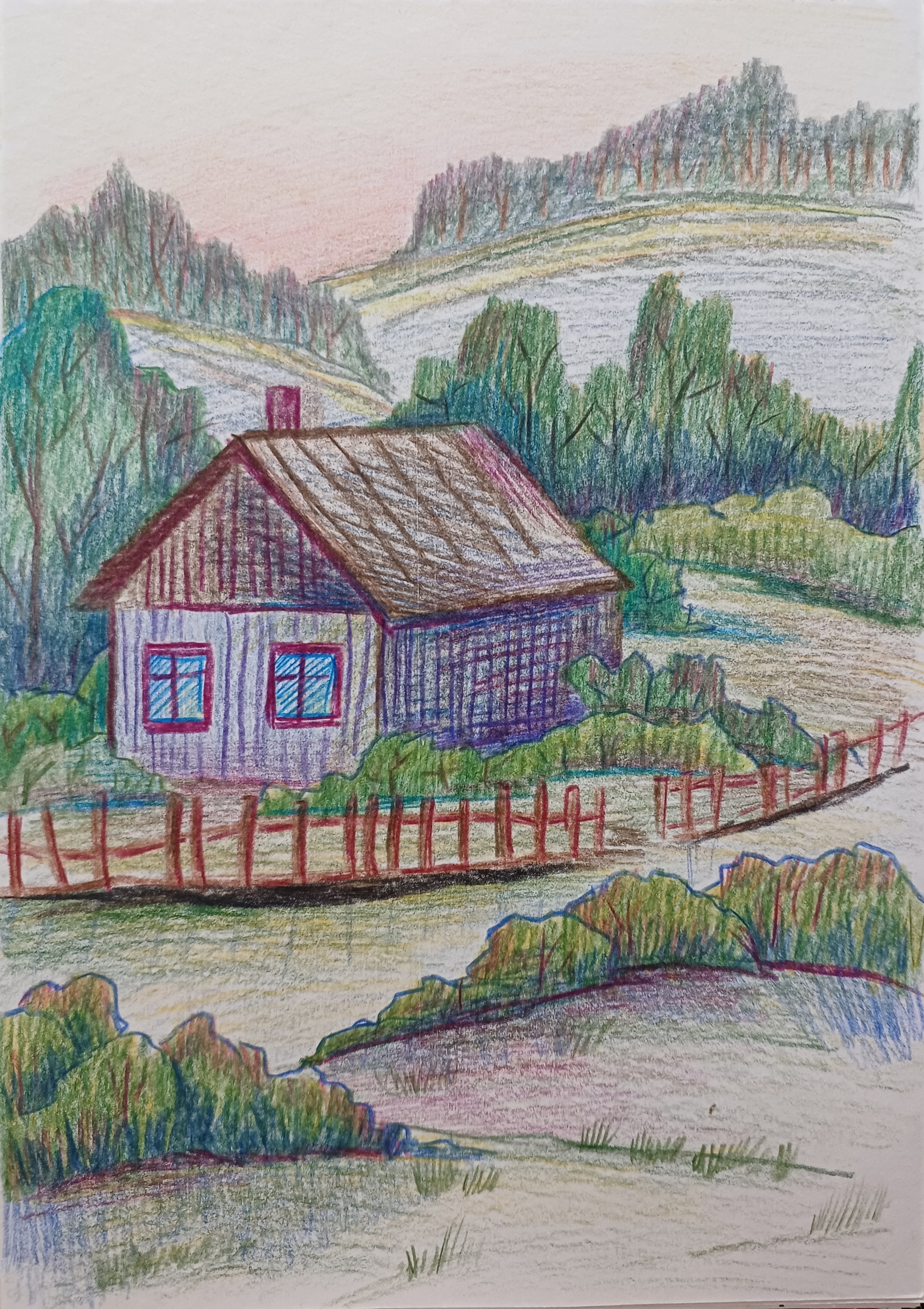 Пейзаж, вечер, карандаши художественные.