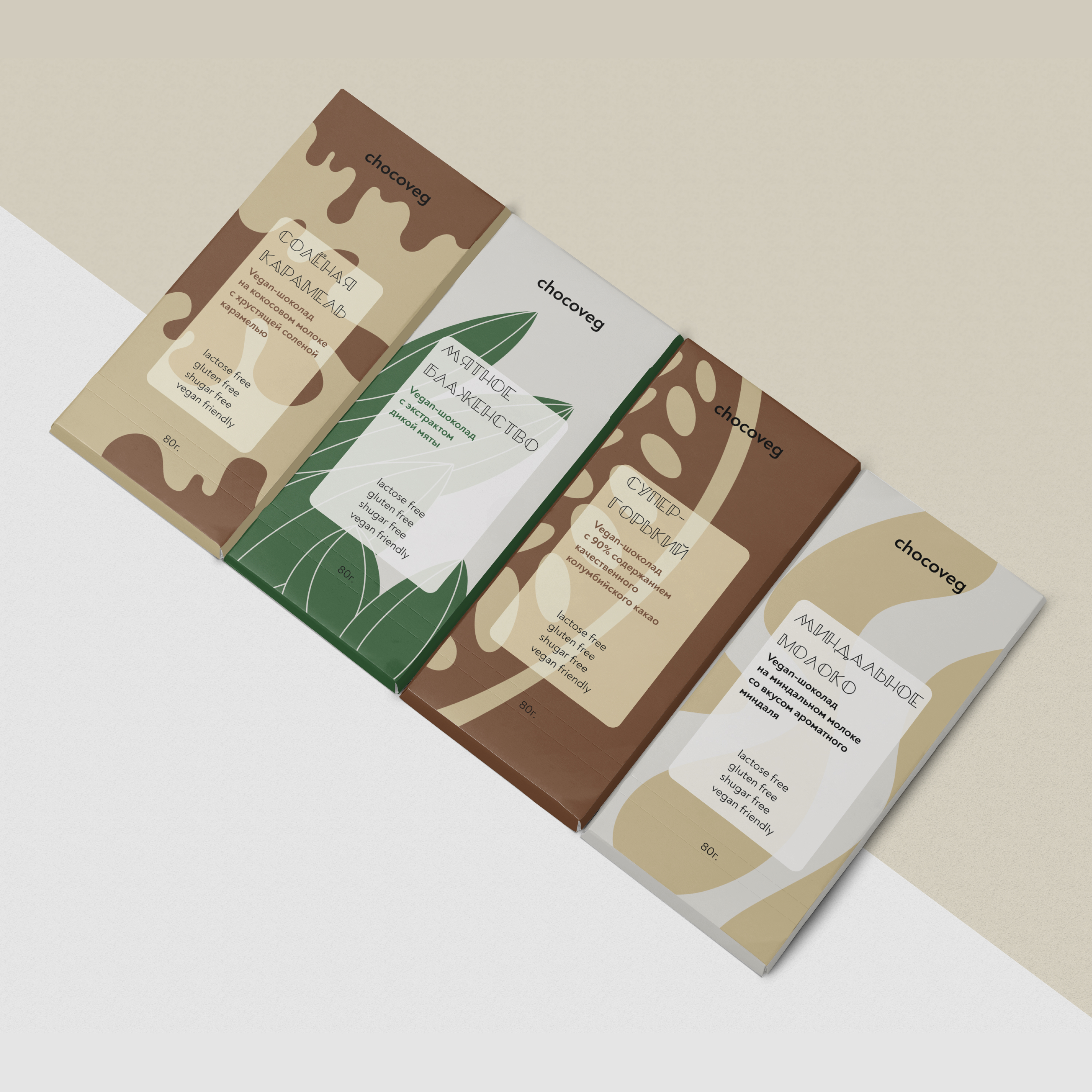Минималистичные иллюстрации для упаковки веган-шоколада с различными вкусами: - солёная карамель, - мята, - горький, - миндальное молоко.