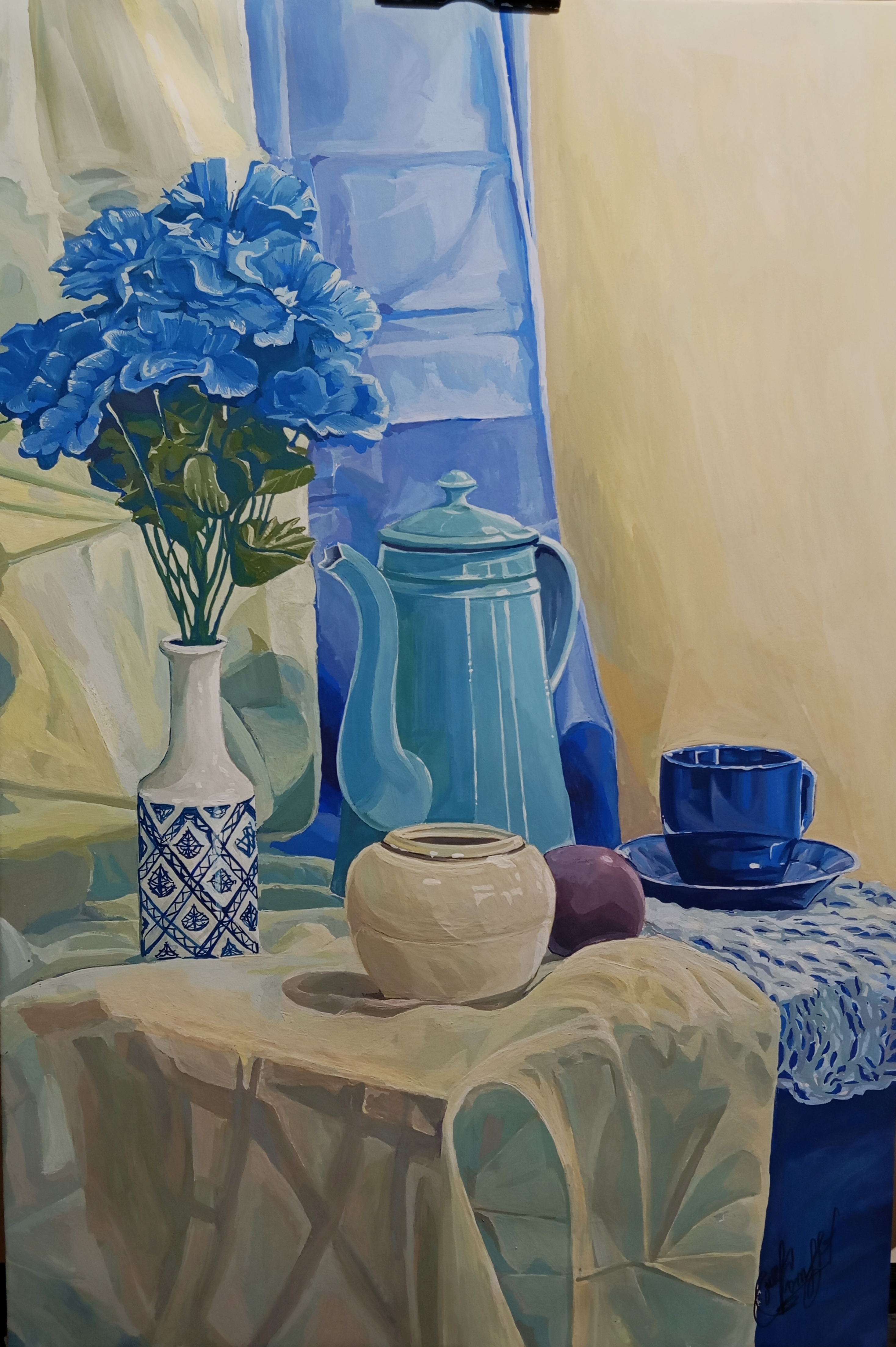 Делюсь своими студенческими работами. Недавно закончил такой вот натюрморт в синих тонах. Давно не работал гуашью, очень сильно помучался с ней)