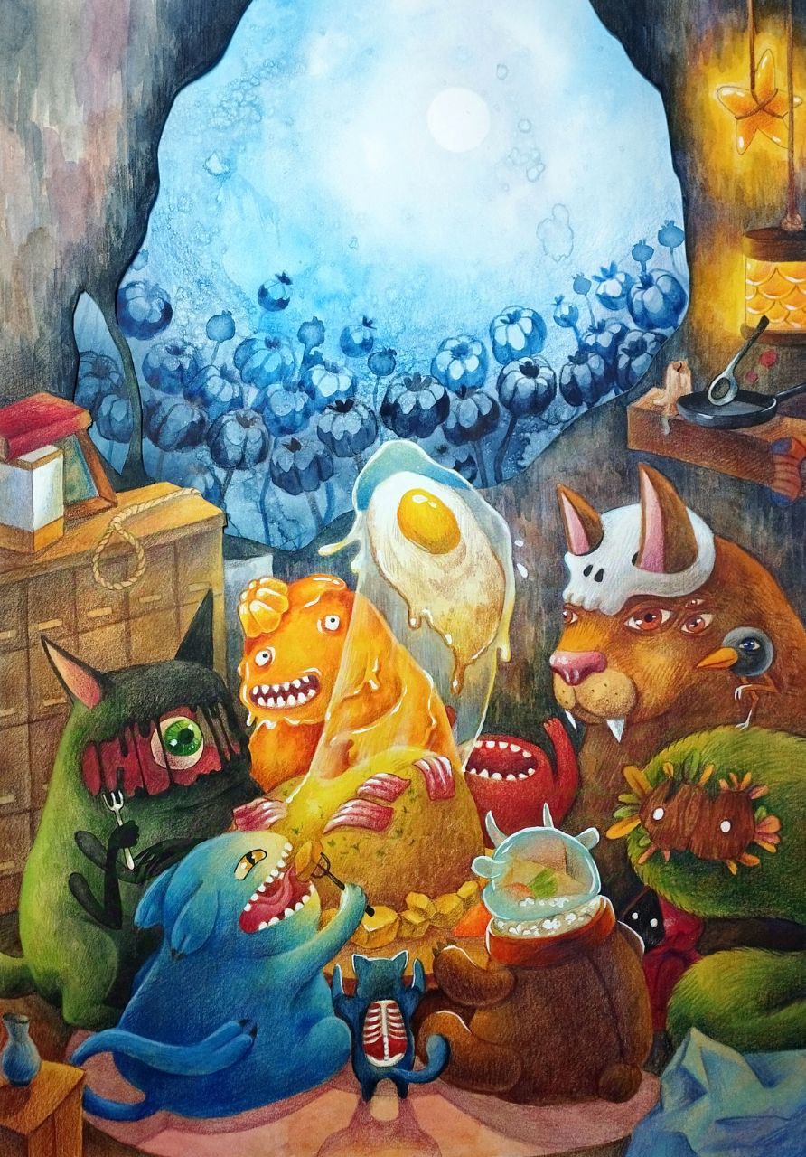 Обожаю посиделки монстров. Акварель (немношк) и много карандашей. Крошечная капля пост обработки.