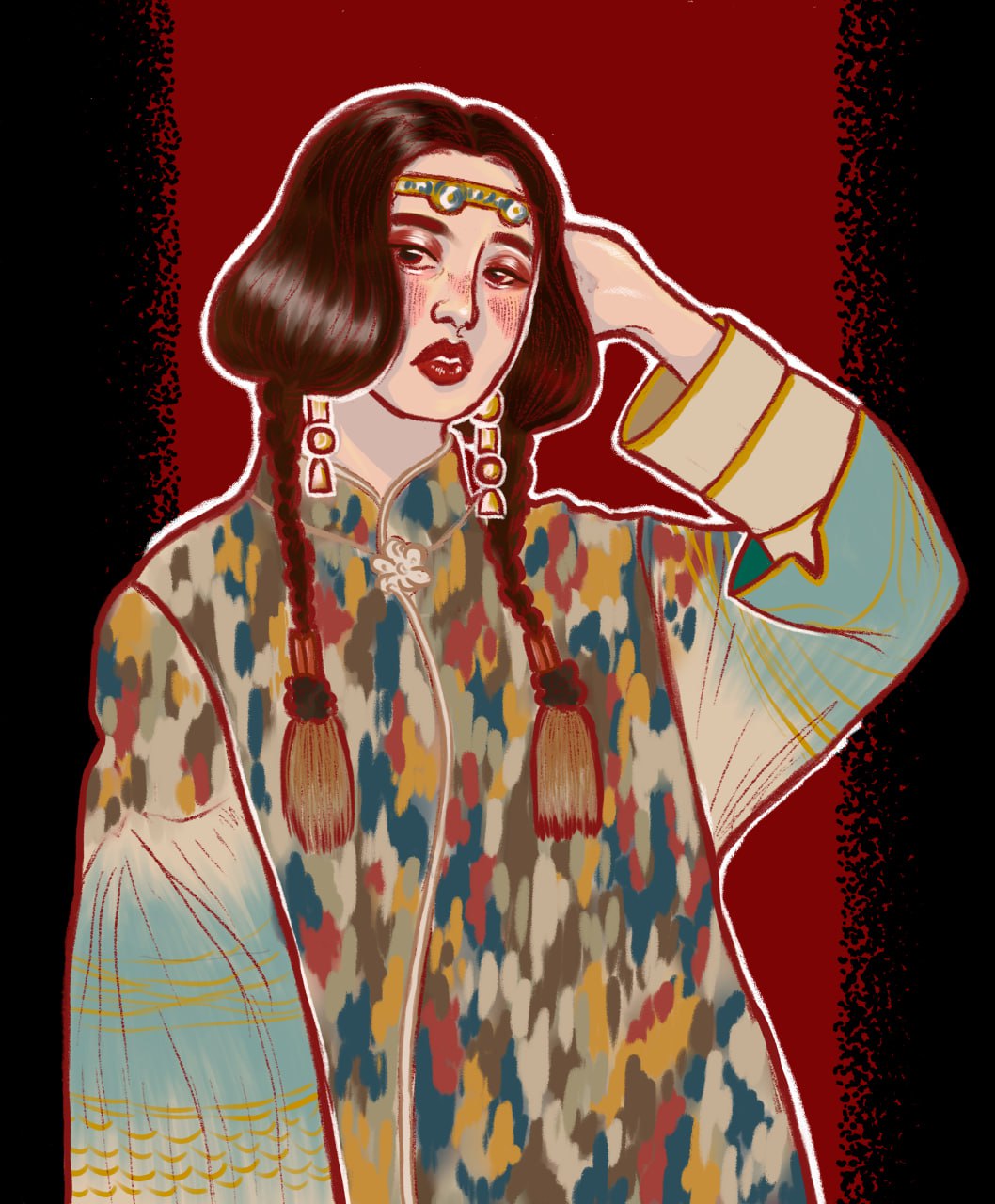 Цифровая иллюстрация, вдохновлённая восточной этникой и народным костюмом. Женский портрет с декоративными акцентами и стилизацией под традиционные узоры.
