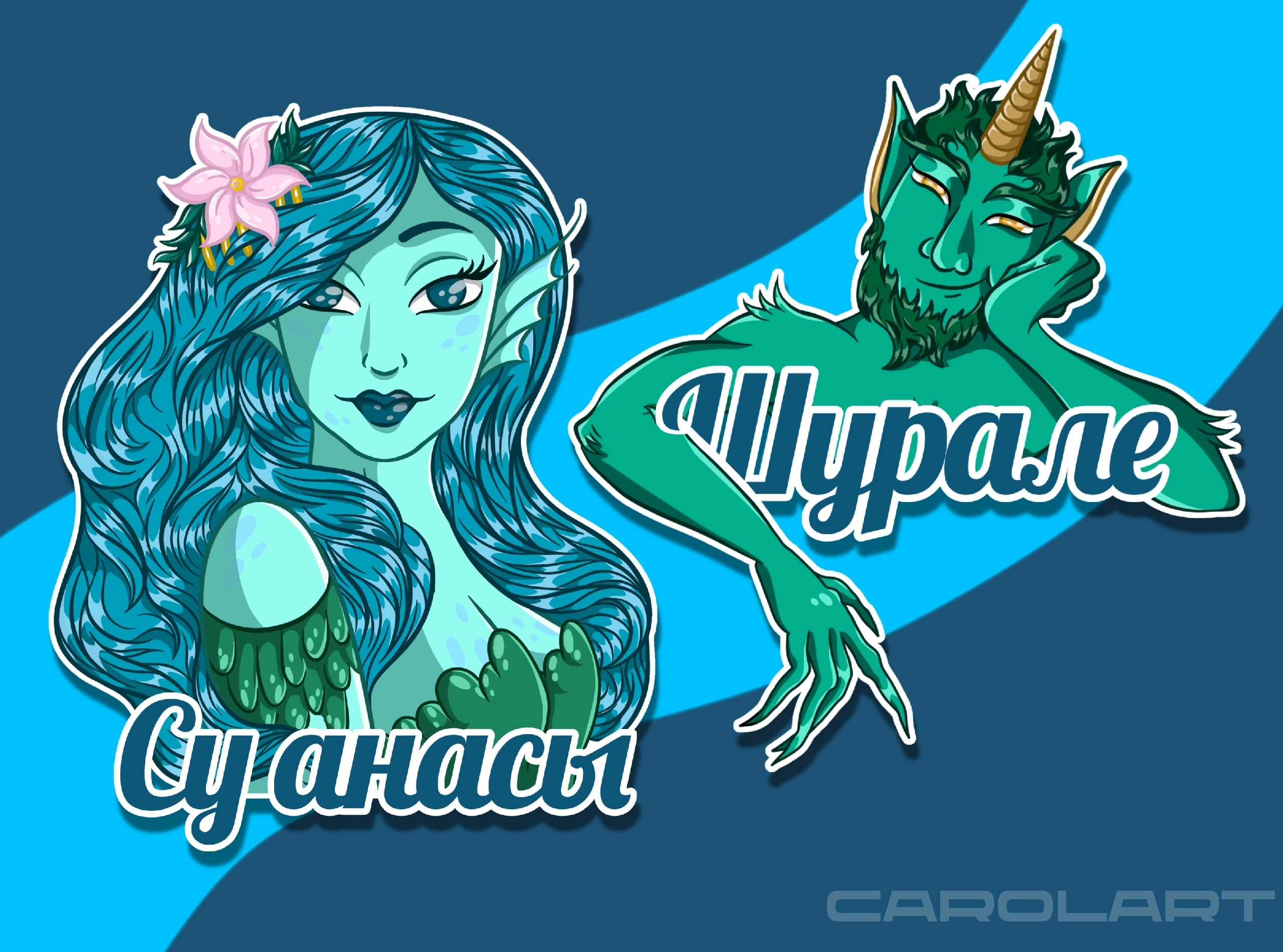 Когда то участвовала в конкурсе и создала таких персонажей для принта футболок. Это Су Анасы и Шурале - герои сказок татарского писателя Габдуллы Тукая.