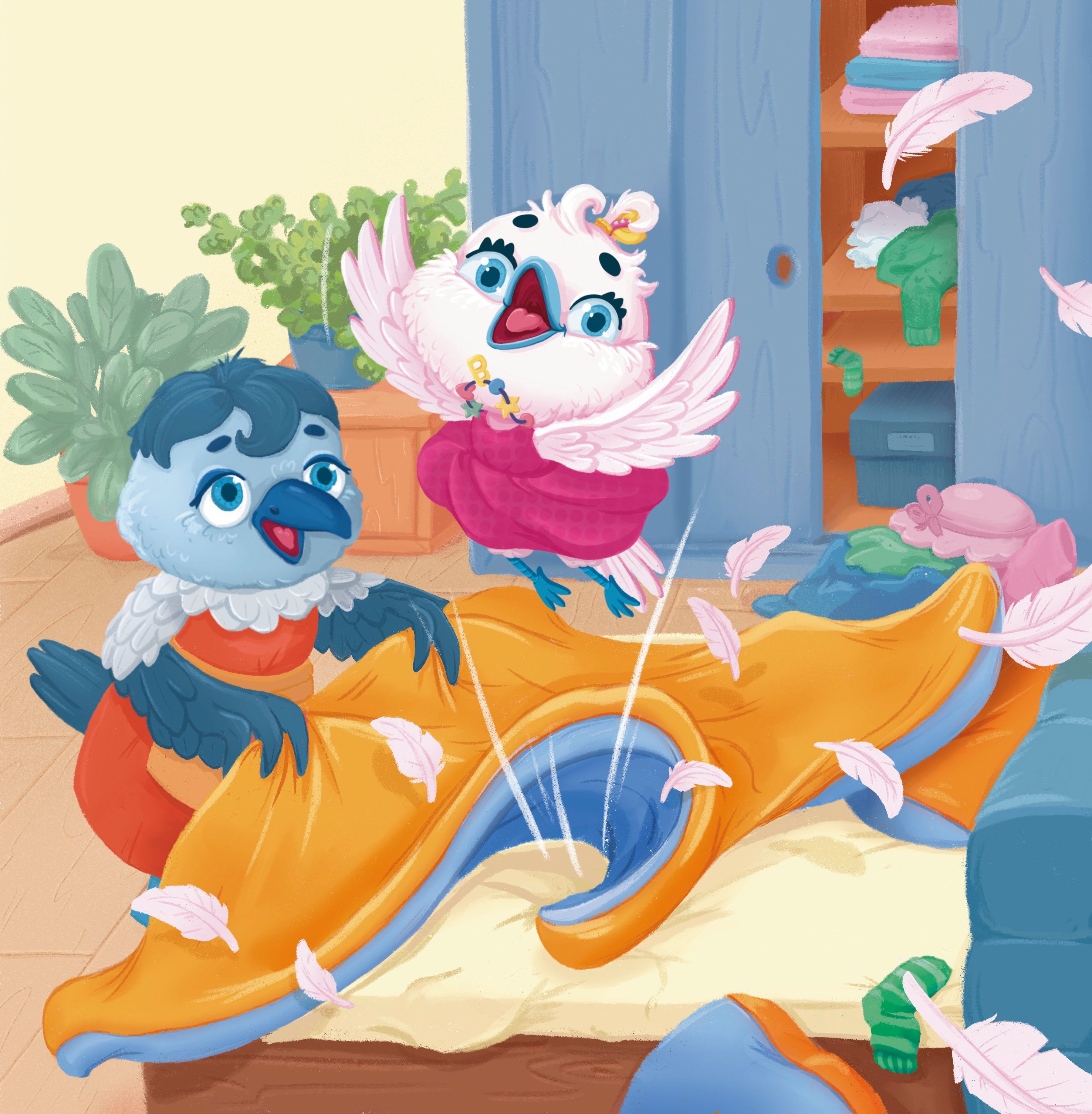 Полосная иллюстрация для детской книжки про малышку ворону, которая вместе с мамой делает домашние дела