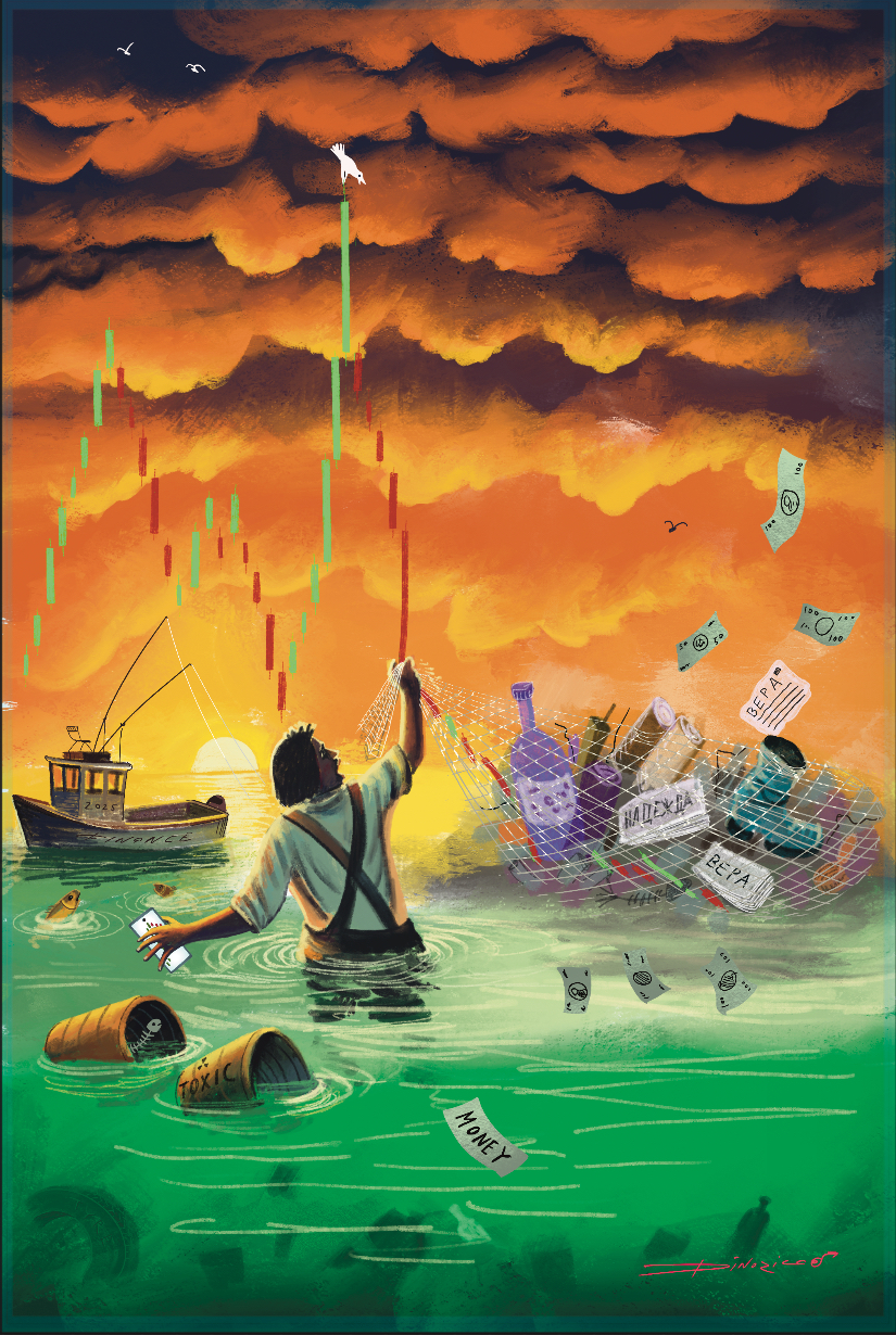 Когда ожидание превращается в неприглядную реальность. Рыбак на море выловил вместо рыбы кучу мусора, потеряв время и изорвав сети. Мораль - разумно оценивайте ваши возможности, и выбирайте место, где не будет токсичных отходов. К карточной игре про финансы. Фрагмент