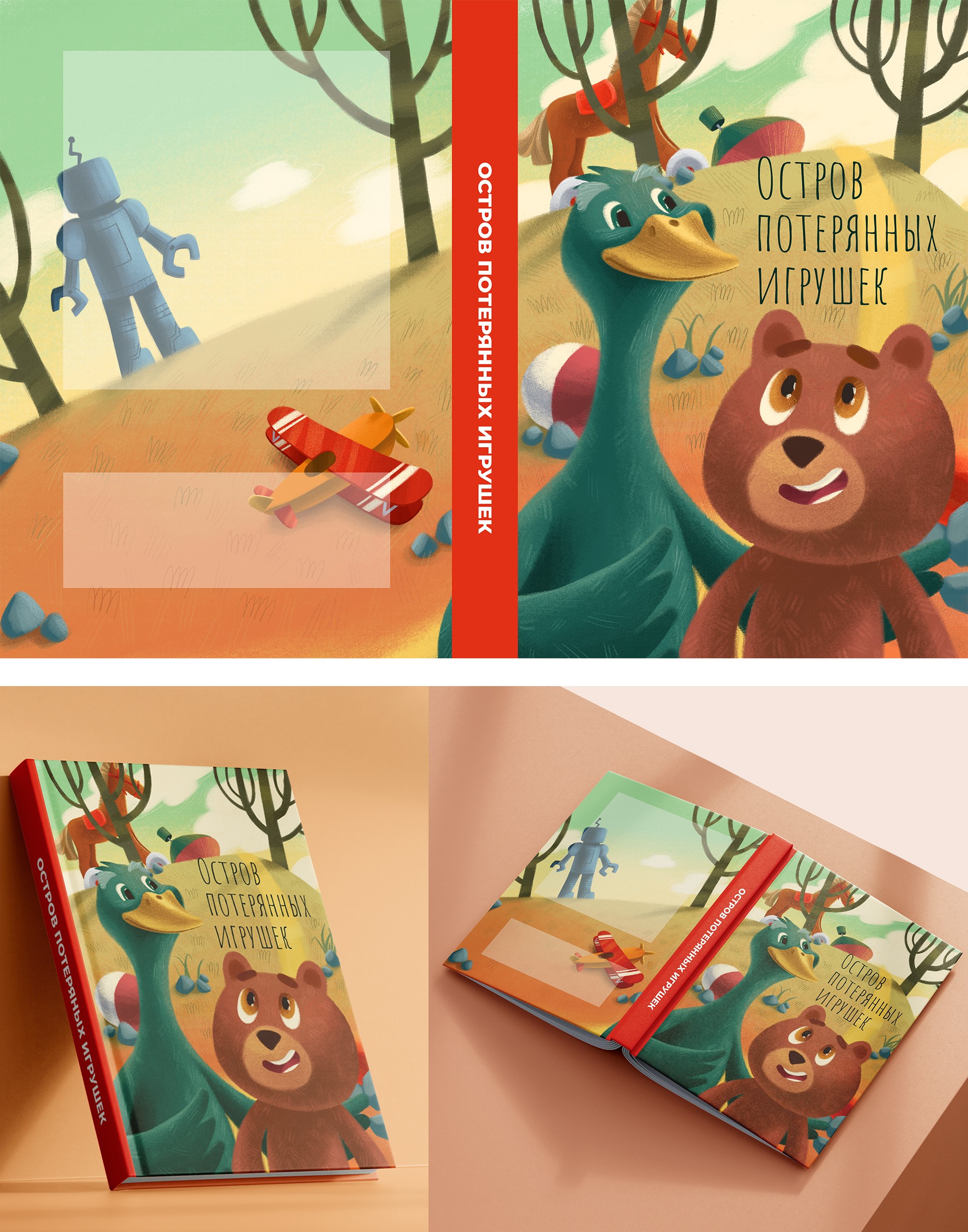 Задачи: Иллюстрация в цветовой гамме должна передавать осеннюю атмосферу, герои которые должны быть изображены на обложке: медвежонок и утка зеленого цвета, на фоне по острову разбросаны детские игрушки