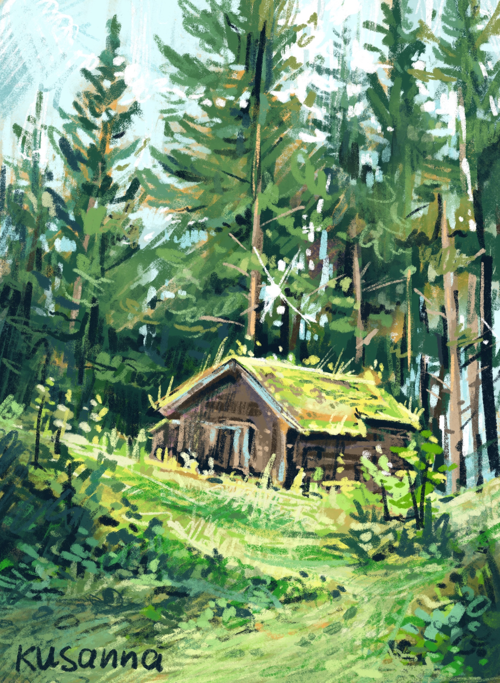 Домик лесника, за стеной елей угадывается озеро. Север. Быстрый набросок за час.