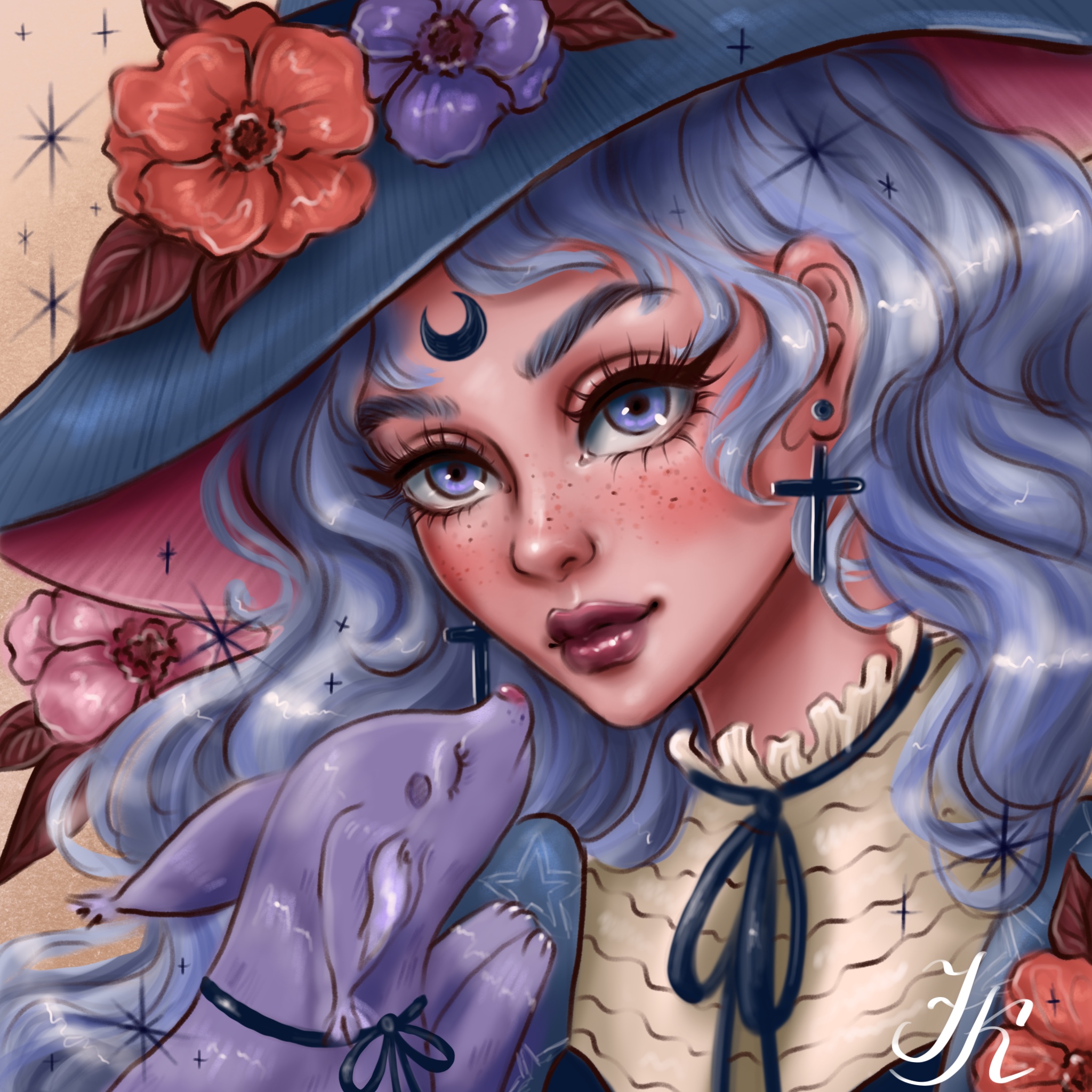 Ведьмочка с фиолетовыми волнистыми волосами с фамильяром лаской на руках. Стиль: мультяшный. сказочный, изящный