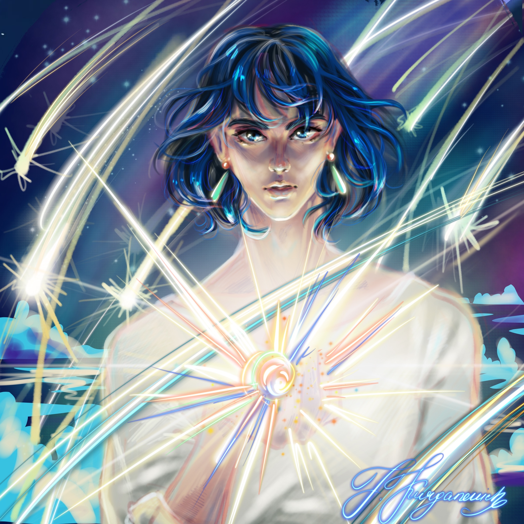 Иллюстрация про колдуна, который обрел магические способности поймав одну из падающих звезд во время большого звездопада. Яркое и светящееся оформление и холодная цветовая гамма.