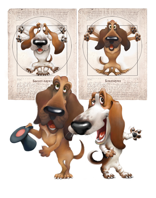 Разработка персонажей и серии иллюстраций для сайта заводчиков собак породы бассет-хаунд.