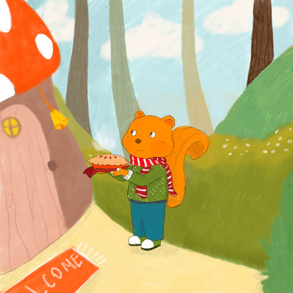 Детская иллюстрация белочки с пирогом