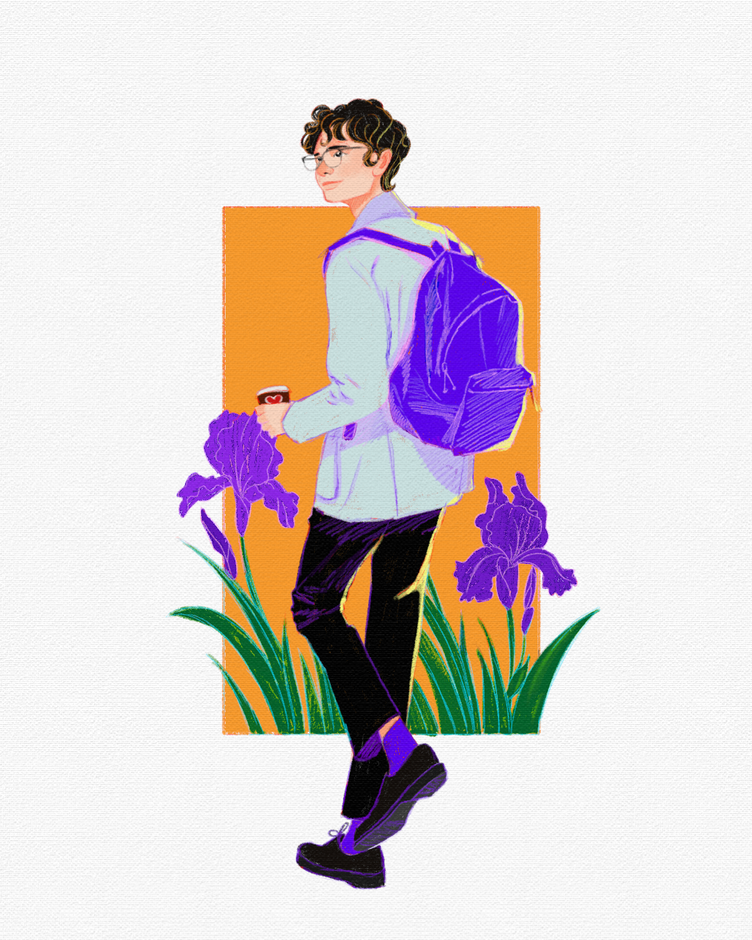 Молодой человек с рюкзаком и чашкой кофе идёт сквозь высокие ирисы на фоне ярко-оранжевого прямоугольника. Иллюстрация передаёт настроение лёгкого начала дня, баланса между урбанистикой и природой. Стильный акцент на фиолетовых деталях создаёт эффект модного арт-портрета.