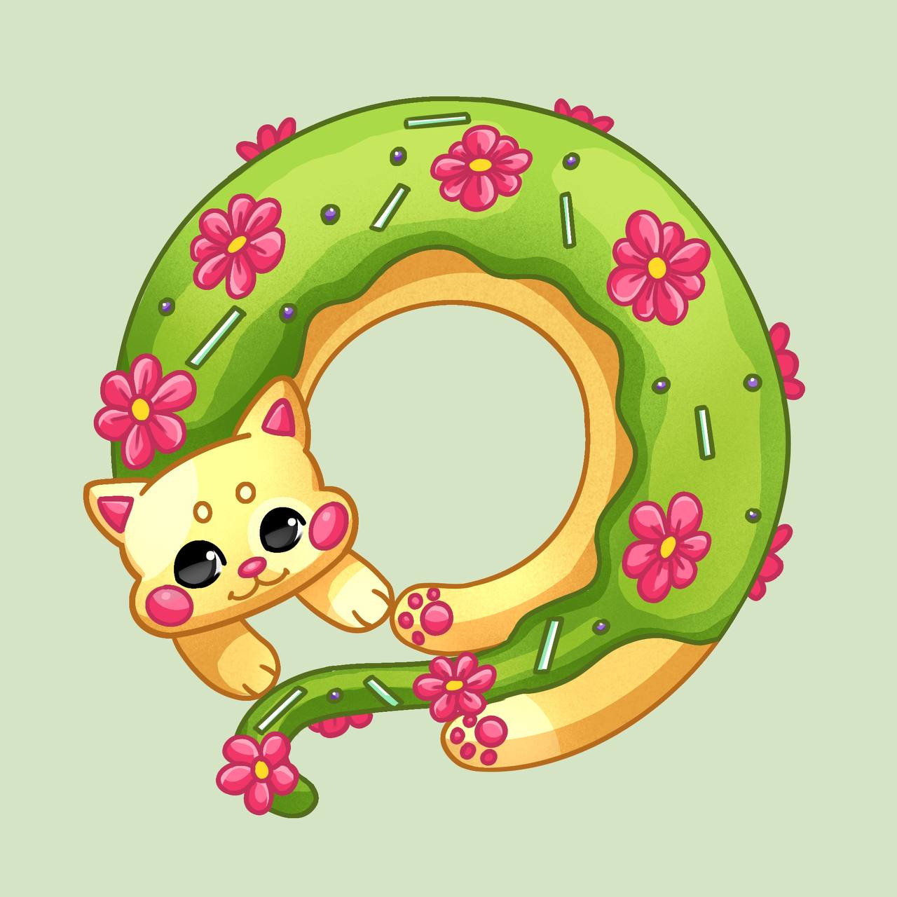Весенний пончик-котик с зелёной глазурью и цветами