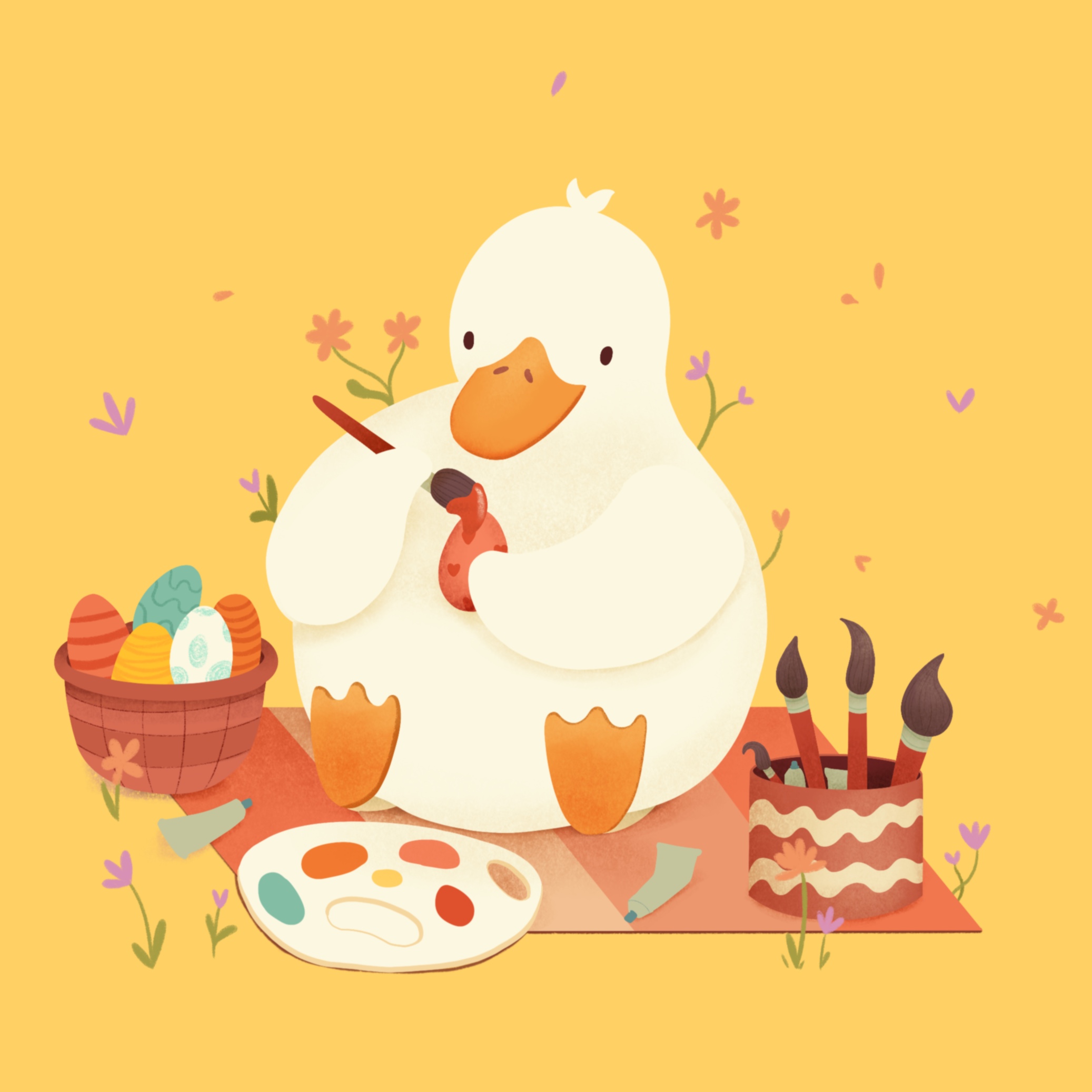 Милая утка красит пасхальные яйца и думает о весне и цветах