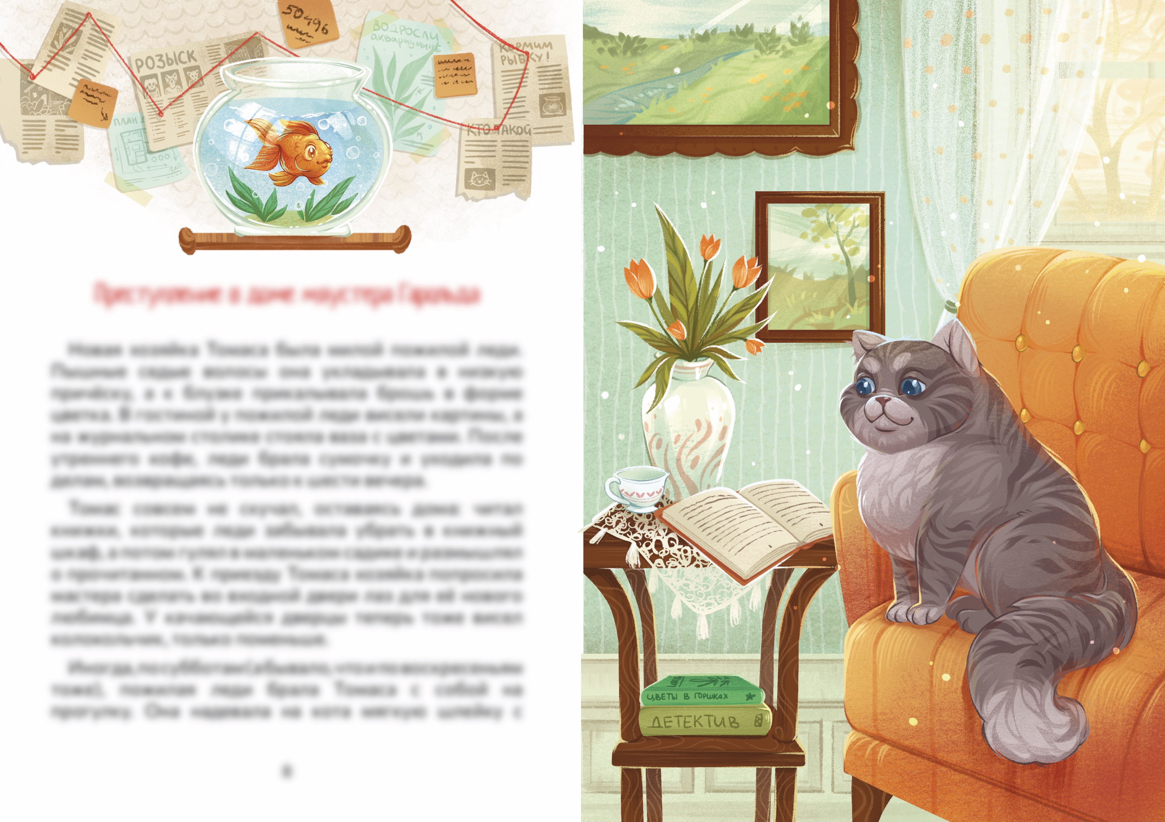 Кот читает книжку, забытую своей хозяйкой на кофейном столике. Разворот для детской книжки
