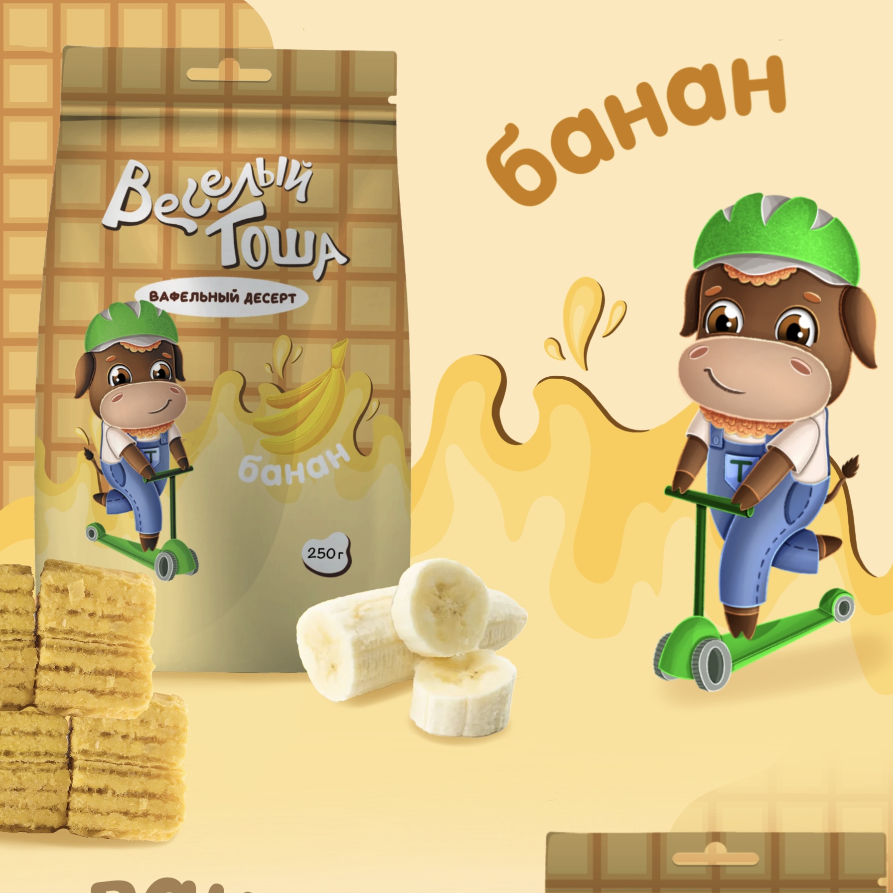 Разработка бренд персонажа для упаковки вафель «Веселый Тоша»