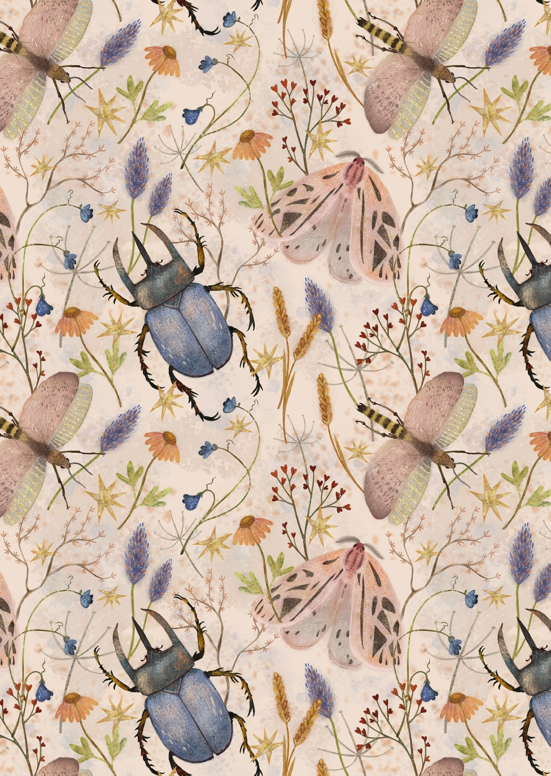 Бесшовный паттерн с насекомыми и полевыми цветами на бежевом фоне. Также есть на белом.