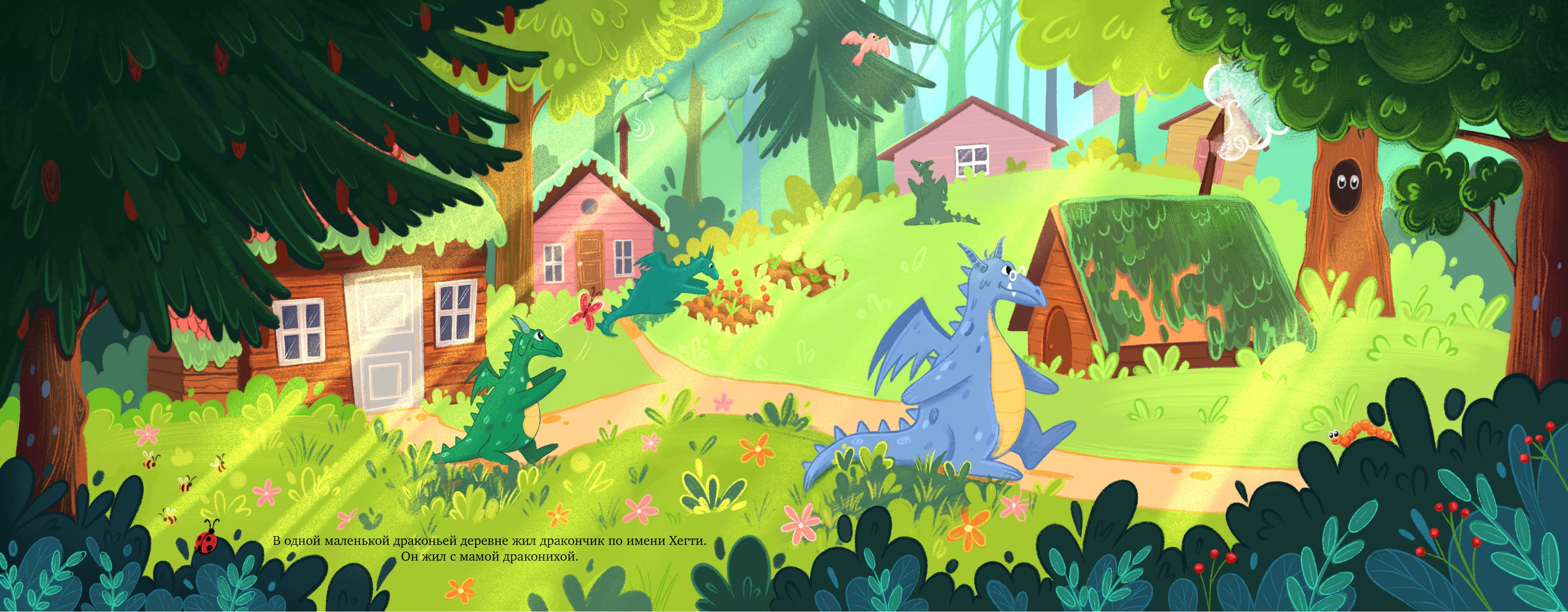 Иллюстрация для разворота детской книги "Дракончик Хегти идет в город"