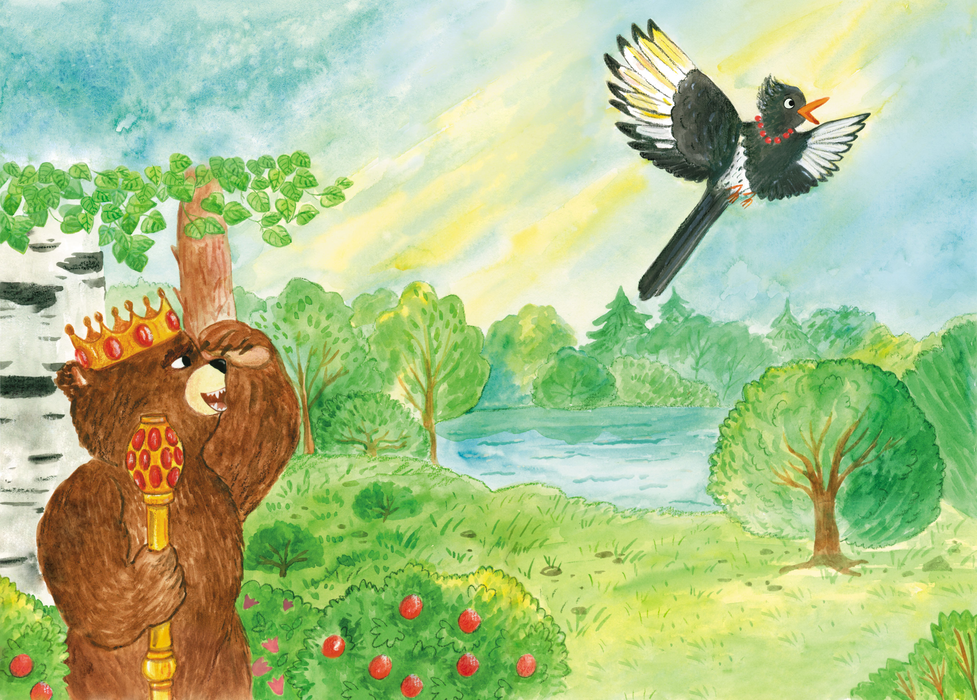 Разворот к сказке Анны Беляковой "Происшествие в лесном царстве". С местом под текст.
