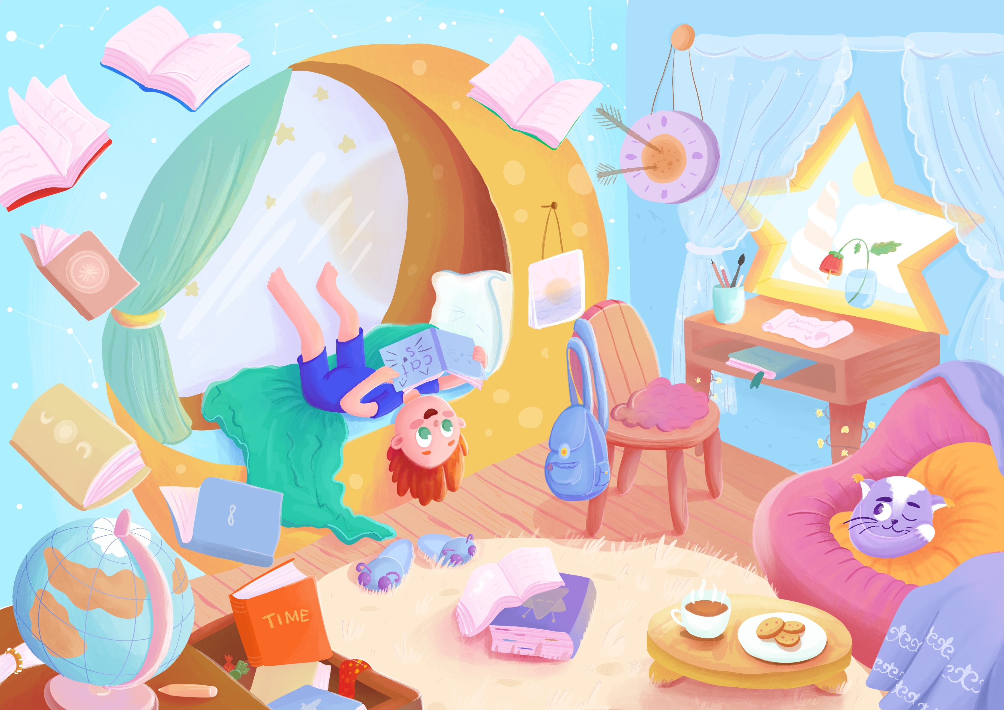 Принц Элиан лежит в своей кровати и читает книгу, Астрин краем глаза подглядывает за парящими книгами в комнате